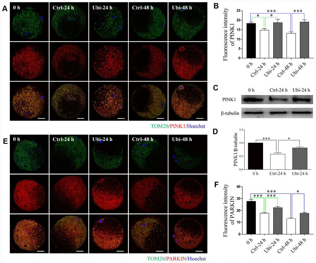 After washing thrice with PBS/PVA, embryos were fixed in 3.7% paraformaldehyde for 30 min at room temperature (20-25°C), permeabilized with PBS/PVA containing 0.5% Triton X-100 at room temperature for 30 min, and incubated in PBS/PVA containing 1.0% BSA at room temperature for 1 h. These embryos were incubated overnight at 4°C with anti-TOM20 (1:100, F-10, Cat # SC-17764, Santa Cruz Biotechnology), anti-PINK1 (1:100; Cat # 23707, Abcam), anti-β-Tubulin (1:100, D-10, SC-5274, Santa Cruz Biotechnology), or anti-PARKIN (1:100; Cat # 2132, Cell Signaling Technology) diluted in blocking solution. After washing thrice with PBS/PVA, the embryos were incubated at room temperature for 1 h with Alexa Fluor 488TM Donkey anti-Mouse IgG (H+L) (1:200; Cat # A21202, Invitrogen) or Alexa Fluor 546TM Donkey anti-Rabbit IgG (H+L) (1:200; Cat # A10040, Invitrogen). Actin was stained with phalloidin-TRITC at 4 °C for 4 h. The oocytes and embryos were stained with 10 μg/mL Hoechst 33342 for 10 min, washed thrice with PBS/PVA, mounted onto slides, and examined using a confocal microscope (Zeiss LSM 710 META). Images were processed using Zen software (version 8.0, Zeiss).