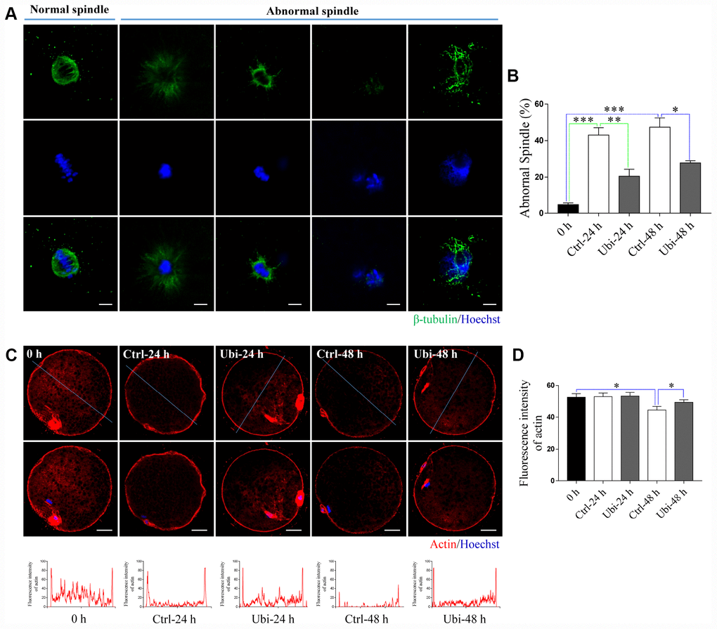 Spindle elongation, dispersal, or disruption was revealed in previous studies [12, 39]. In our study, spindle integrity was observed by immunostaining. As shown in Figure 6A and 6B, aging caused an increase in abnormal spindles (p < 0.001); however, ubiquinol-10 decreased the rate of abnormal spindles, compared to the aging group, at both 24 and 48 h (p < 0.05). Actin was stained with phalloidin-TRITC. The actin signal was decreased in oocytes after 48 h of aging (Figure 6C). However, compared to the aging-only group at 48 h, ubiquinol-10 was able to maintain the expression of actin (Figure 6C). Statistical analysis showed that, compared to fresh oocytes, the intensity of actin was decreased after 48 h (P < 0.05) but not 24 h of aging (P > 0.05, Figure 6D). However, ubiquinol-10 can maintain the intensity of actin until 48 h of aging (Figure 6D).