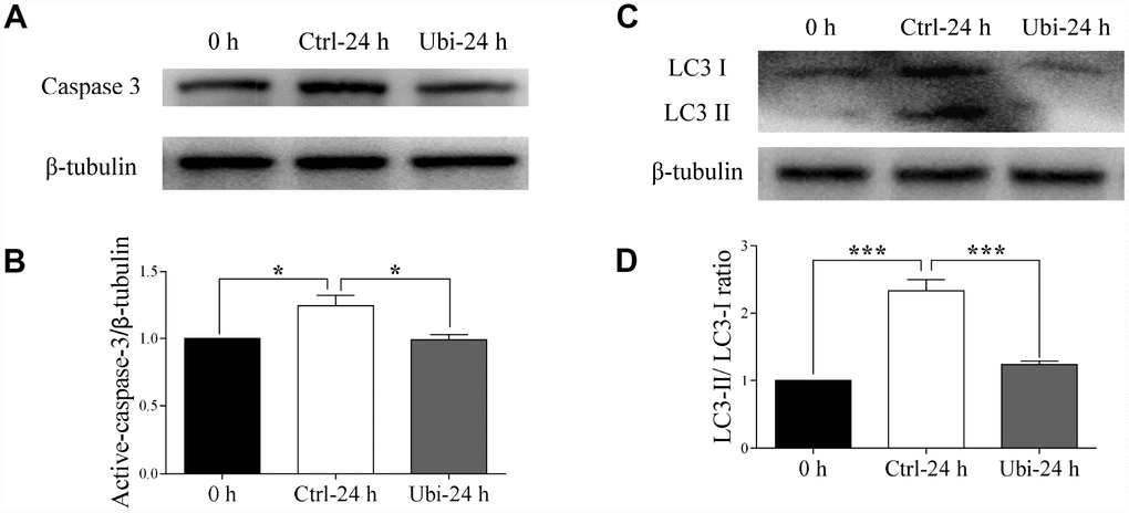As a result of the activation of caspases, the process of postovulatory aging culminates in apoptosis [15, 40]. Thus, to detect whether postovulatory aging was prevented, the expression of active-caspase 3 was examined by western blotting. As expected, the expression of active-caspase 3 was increased in the aging oocytes, compared to fresh oocytes (p < 0.05, Figure 7A and 7B). However, the addition of ubiquinol-10 prevented the aging-induced increase in active-caspase 3 expression at 24 h (p < 0.05, Figure 7A and 7B). In addition, postovulatory aging induced an increase in autophagy, which was prevented by supplementation with ubiquinol-10 at 24 h of aging (p < 0.001, Figure 7C and 7D). These results clearly demonstrate that ubiquinol-10 can rescue postovulatory aging-induced cell death and is a potent chemical that can delay postovulatory aging.