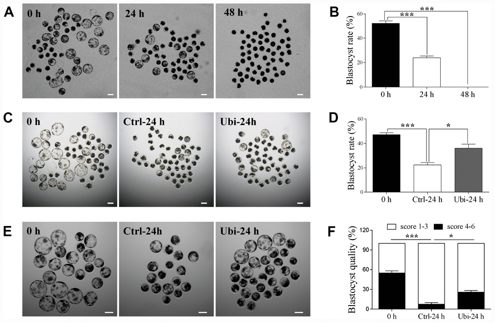 Lastly, after parthenogenetic activation, the embryonic developmental competence was estimated by the blastocyst rate at day 6. The results showed that the blastocyst rate was considerably reduced after 24 h of aging (p < 0.001, 52.0 ± 1.9 % vs. 23.9 ± 1.2 %) and that no blastocyst was formed after 48 h of aging (p < 0.001, Figure 8A and 8B). Therefore, the protective capacity of ubiquinol-10 on the embryonic developmental competence of aging oocytes was detected after 24 h of aging. Compared with the aging group, the blastocyst rate was improved in the ubiquinol-10 treatment group (p < 0.05, 22.4 ± 0.4 % vs. 36.2 ± 2.8, Figure 8C and 8D). Moreover, the number of blastocysts of grade 4–6 were substantially decreased after 24 h of aging (p < 0.05, 54.8 ± 3.2 % vs. 7.5 ± 2.4 %); however, ubiquinol-10 supplementation (25.9 ± 2.4 %) significantly increased the blastocysts of grade 4–6 in comparison with the aging-only group (p < 0.05, Figure 8E and 8F). These results revealed that blastocyst formation and quality were both improved by the addition of ubiquinol-10.
