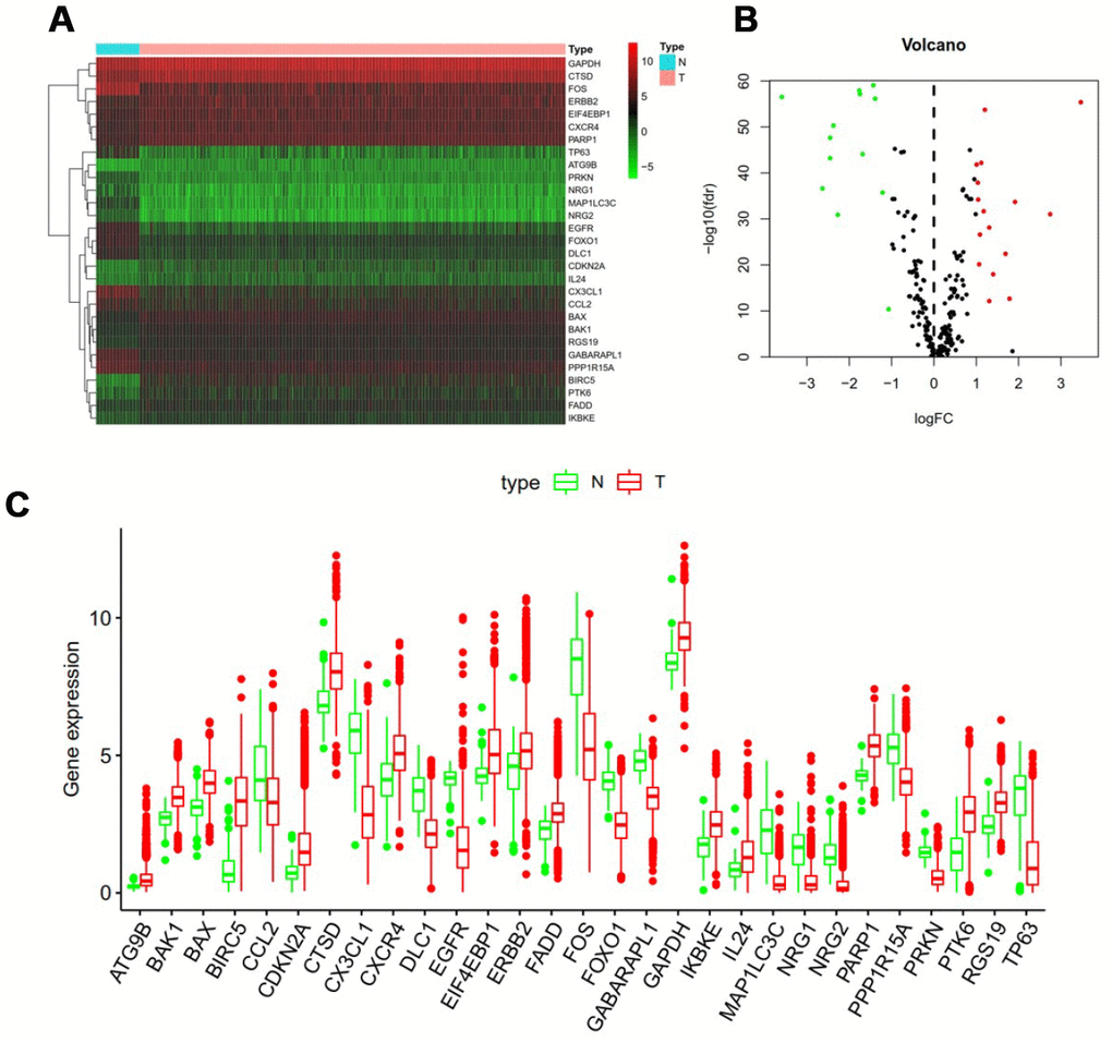 In addition, a scatter plot was visualized to show the expression pattern of 29 differentially expressed ARGs between breast cancer and non-tumor tissue (Figure 1C). Scatter plot showing expression patterns of 13 down-regulated genes (CCL2, DLC1, EGFR1, CX3CL1, FOS, FOXO1, GABARAPL1, MAP1LC3C, NRG1, NRG2, PPP1R15A, PRKN and TP63) and 16 Up-regulated genes (ATG9B, BAK1, BAX, BIRC5, CDKN2A, CTSD, CXCR4, EIF4EBP1, ERBB2, FADD, GAPDH, IKBKE, IL24, PARP1, PTK6 and RGS19).