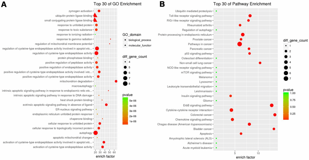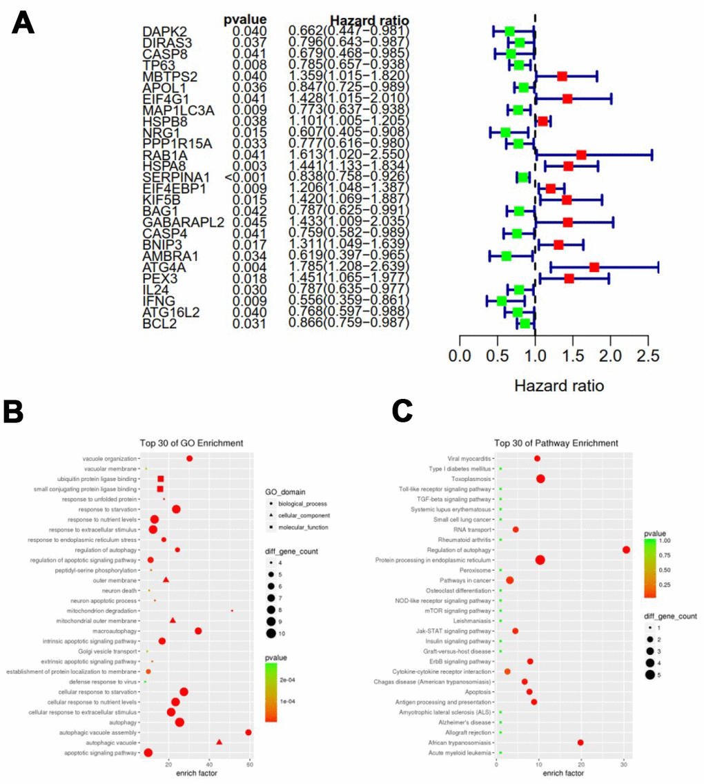 Functional enrichment analysis of 29 differentially expressed ARGs provides a biological understanding of these genes. Top 30 of GO enrichment and top 30 of pathway enrichment are summarized in Figure 2A. GO enrichment shows that the biological process of differential genes is mainly involved in autophagy, apoptosis and endopeptidase regulation. KEGG enrichment shows that pathways of differential genes mainly involve pathways in cancer, protein processing in endoplasmic reticulum, cytokine-cytokine receptor interaction and the like (Figure 2B).