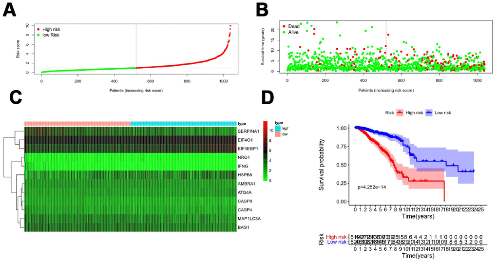 We identified a group of ARGs that predict the prognosis of breast cancer patients. Most of these genes have been reported in previous studies to be closely related to the prognosis of breast cancer or other malignancies [12]. Loss of CASP8 protein expression is associated with a poor prognosis in children with medulloblastoma [13]. Muhammad JS et al. [11] reported that Helicobacter pylori-induced MAP1LC3 methylation silencing may impair autophagy and promote gastric cancer. Overexpression of EIF4G1 is associated with tumor progression and poor prognosis in nasopharyngeal carcinoma [14]. HSPB8 promotes cancer cell growth and is associated with poor prognosis in patients with gastric cancer [15]. Overexpression of phosphorylated EIF4EBP1 is closely associated with tumor recurrence and worse survival outcomes of cervical cancer [16]. Afentakis M et al reported that the incidence of distant recurrence in women with higher BAG1 expression was reduced by 30% compared with women with low expression of breast cancer [17]. The circulating NRG1 reported by De Iuliis F et al. may be a biomarker for the prognosis of breast cancer patients [18]. Boccellino M et al found that SERPINA1 may be a useful biomarker for early detection of lung cancer and monitoring its evolution [19]. ATG4A has been reported to promote tumor metastasis by inducing epithelial-mesenchymal transition and stem cell-like properties of gastric cells [20]. In triple-negative breast cancer, high expression of IFNG was found to be associated with better disease-free survival. The focus of this study was on the relationship between the mRNA expression of ARGs and the prognosis of breast cancer patients. It is known that the genetic alternation of genes is likely to affect the expression levels of their mRNAs. Gene amplification is often positively correlated with up-regulation of mRNA expression. For example, we noted that gene amplification and mRNA upregulation are the most common genetic variants for the EIF4EBP1.