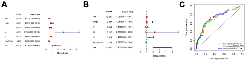 Figure 5 showed distribution of prognostic index in TCGA dataset (Figure 5A), survival status of patients in different groups (Figure 5B) and heatmap of the expression profile of the included ARGs (Figure 5C). To determine the performance of the API in predicting clinical outcomes in breast cancer patients, K-M survival curves were plotted to analyze different survival times between high-risk and low-risk groups. K-M analysis showed that the survival rate of patients in the high-risk group was significantly lower than that in the low-risk group (Figure 5D). Univariate analysis showed that ARI was significantly associated with patient prognosis (Figure 6A). In addition, after adjusting for clinicopathological features such as age, tumor subtype, tumor stage, tumor size, and lymph node metastasis, API remained an independent prognostic indicator for breast cancer patients in multivariate analysis (HR = 3.105, 95% CI = 1.988-4.848; P < 0.001; Figure 6B). The area under the curve of the corresponding receiver operating characteristic (ROC) curve for 1 year, 3 years, and 5 years of survival is 0.739, 0.727, and 0.742, respectively. This indicated that the prognostic index based on ARGs has a certain potential in survival prediction (Figure 6C).