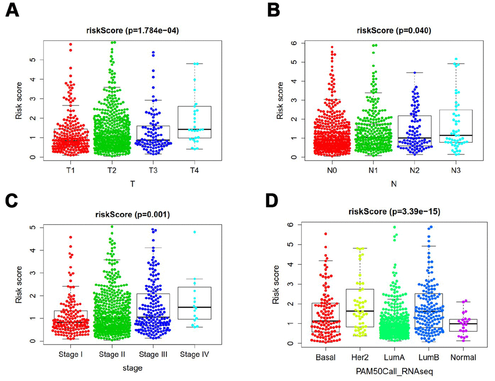 Relationship between ARGs prognostic index and clinical features were subsequently analyzed. Significant increases in risk score were in larger tumor size (Figure 7A), lymph node metastasis (Figure 7B), late clinical stage (Figure 7C), HER2 subtype and luminal B subtype (Figure 7D).