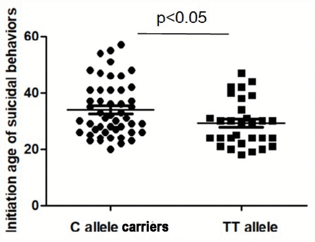 The study has several limitations that should be noted. First, although the sample was large, only 152 patients with suicidal behaviors were included. Therefore, the relationship between TNF-alpha gene and suicidal tendencies in SCZ was preliminary, and further validation needs to be carried out in a larger, independent sample to increase statistical capacity before a definitive conclusion can be drawn. Second, there are several known polymorphisms in the promoter of TNF-alpha gene, but we had measured only two of those polymorphisms. Whether the other variants affected the results of this study is unclear. A complex analysis of the influences of polymorphisms in the gene should be examined in further researches. Third, the levels of TNF-alpha and other inflammatory cytokines in the cerebrospinal fluid and blood were not measured in this study. Therefore, we were unable to assess whether the T allele of the -1031T/C caused a decrease in TNF-alpha levels in the brain. Fourth, one of the major limitations of the current study is short of data on suicide method and associated lethality. Therefore, suicide attempts were not classified as serious suicide attempts. Therefore, we were able to only explore various factors related to suicide attempts, rather than the severity of the suicidal behaviors. In further investigations, an appropriate tool to evaluate the severity of suicide attempts would be warranted. Fifth, the hidden demographic stratification in our sample may be a confounding factor. We had a small number of female patients that may cause a discrepancy in results. Sixth, all SCZ patients enrolled in this current study were inpatients with long-term duration of illness. Hence, our findings were limited to chronic inpatients with longer duration of symptoms and more severe psychopathological symptoms compared to the typical psychiatric outpatients. Therefore, our findings in this study could not be generalized to other patients. Seventh, it is important to tease out how the genetic variation at the specific locus is getting translated into a phenotypic variation. However, we did not test the functional relevance of -1031C/T by using an in vitro cellular model, which should be remedied in the future study. Finally, although previous study showed that the C allele of TNF alpha-1031C/T was associated with higher expression of TNF-alpha (El-Tahan et al 2016), we did not measure TNF-alpha levels in this study. It would be better if the blood level of TNF-alpha could be provided in the same patient sample to increase the validity of this paper. Thus, we could not provide the mechanistic explanation linking the C allele to later age of suicide attempt in SCZ patients, which deserves further investigation.