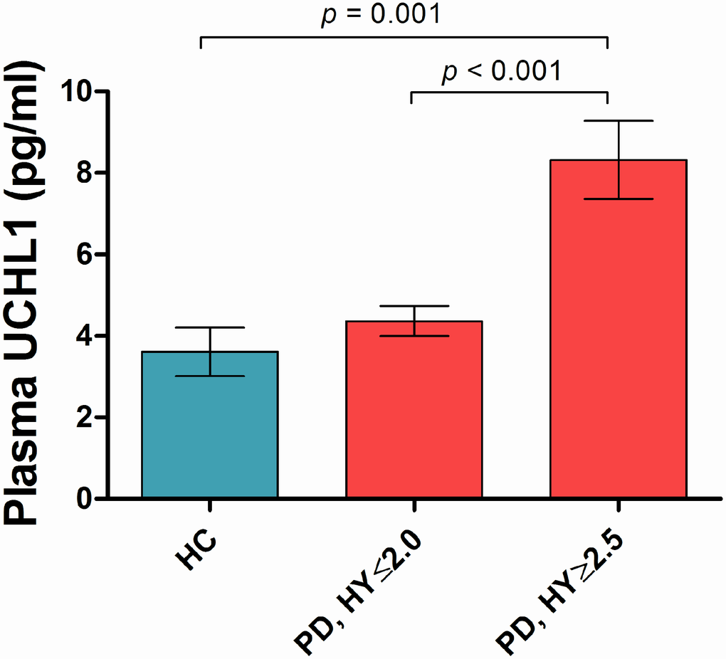 In summary, we used ultrasensitive single molecule technology to show that plasma UCHL1 levels are significantly higher in PD patients at more moderate stages of disease than in both mild PD patients and healthy controls. UCHL1 levels significantly correlated with motor severity, but not global cognition. To our knowledge, this will be the first study reporting UCHL1 levels in blood samples from PD patients, as well as the first study investigating the relationship between SNCA Rep1 promoter variability and UCHL1. Although the study included a substantial number of PD patients, we acknowledge the comparatively smaller sample size of healthy controls. Future studies with a larger cohort of PD patients and healthy controls are needed to confirm our findings. Our preliminary findings provide impetus for further validation in longitudinal cohorts to determine if UCHL1 correlates with disease progression. If confirmed, modulation and possibly overexpression of UCHL1 activity could serve as a therapeutic tool in enhancing the autophagy pathway and inducing clearance of α-synuclein aggregates in PD. Studies to assess its potential utility as a predictive biomarker and as a novel therapeutic target in PD are warranted.