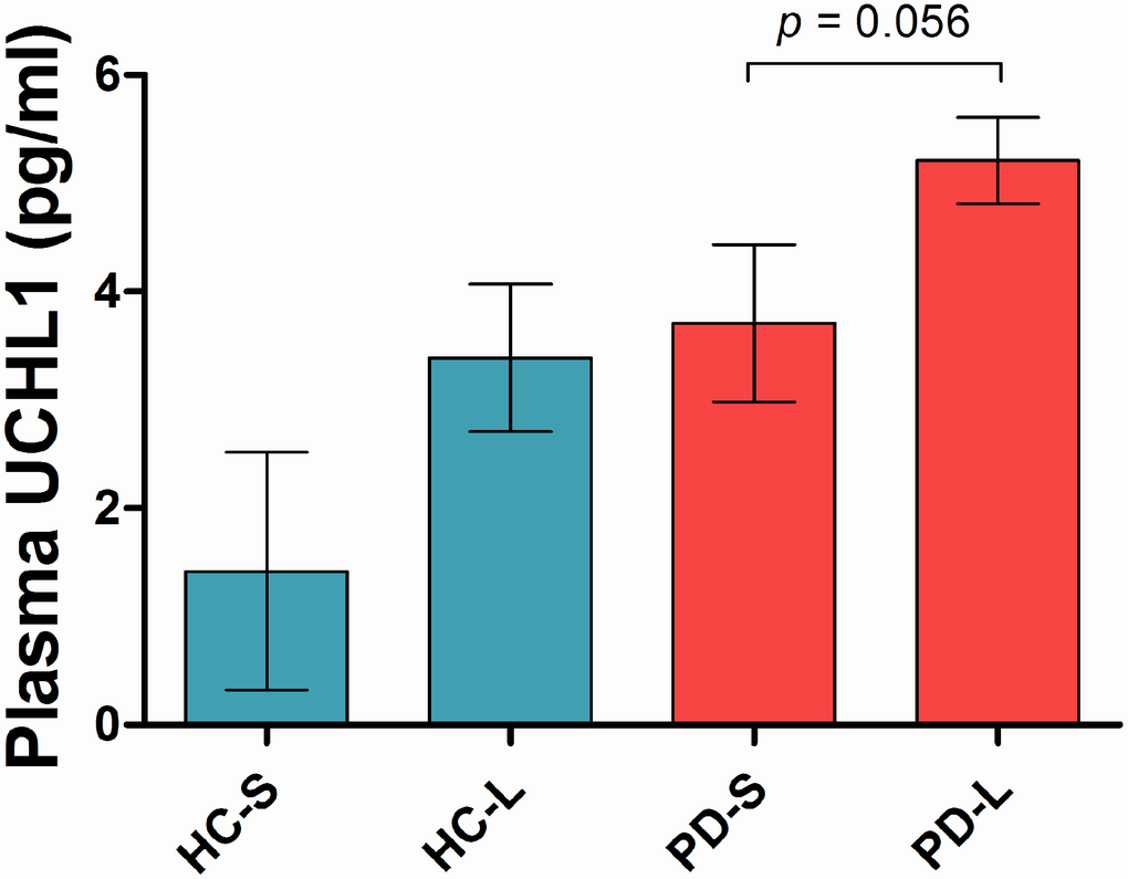 Patients were stratified according to their SNCA Rep1 allele length and investigated for the effect of Rep1 genotype on plasma UCHL1. There were 83% long SNCA Rep1 and 17% short carriers in the PD group; while there were 77% long and 23% short carriers in the healthy control group. In the PD group, there was a near-significant trend towards higher UCHL1 levels in carriers of long SNCA Rep1 alleles vs short alleles (5.21 vs 3.71 pg/ml, p= 0.056, Figure 2), while a non-significant trend was seen in healthy controls carrying long Rep1 vs short alleles (3.39 vs 1.42 pg/ml, p= 0.207), adjusted for age and gender, and disease duration in the PD group.