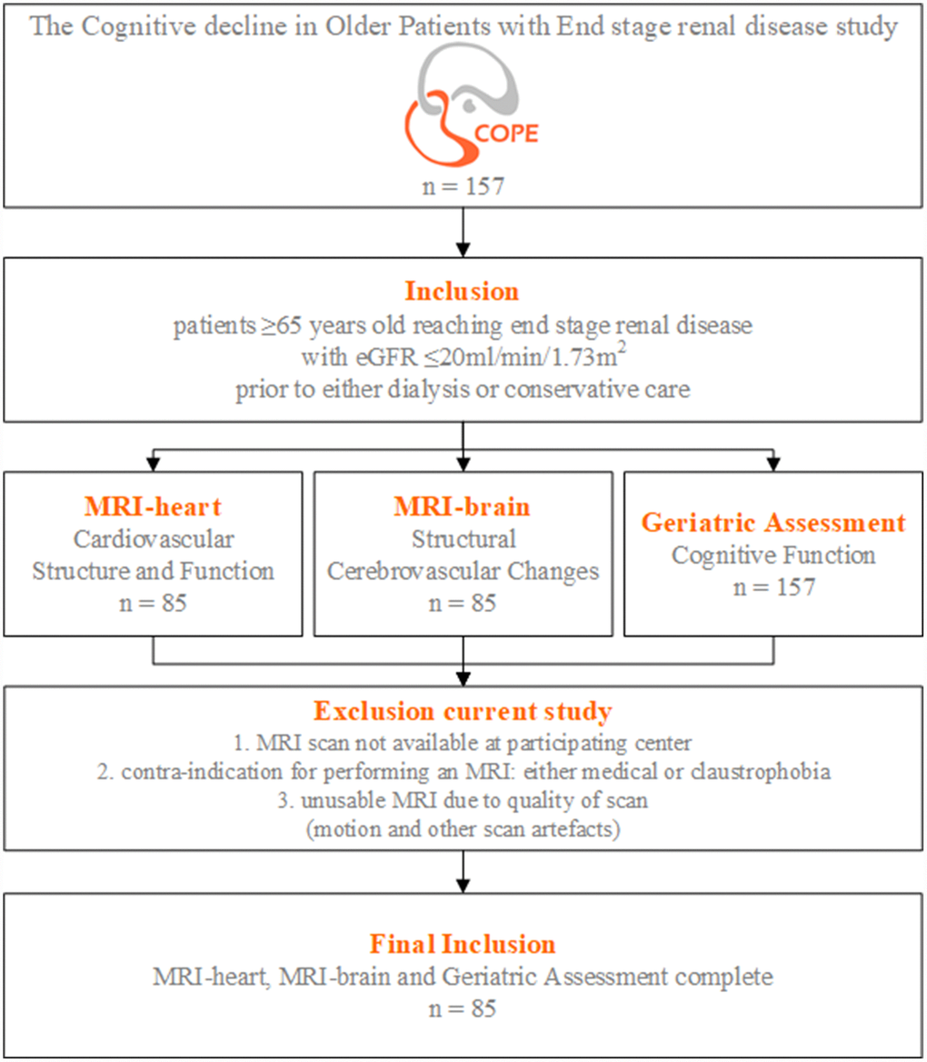 Data of ‘The Cognitive decline in Older Patients with End stage renal disease’ (COPE) study were used, a Dutch prospective, multicenter cohort study. A detailed description of the rationale and design of COPE, including all in- and exclusion criteria, has been published previously [29]. In summary, patients ≥65 years old reaching ESRD with eGFR ≤20ml/min/1.73m2 (CKD stage 4 and 5) were included, prior to either dialysis or conservative care. The main study objective was to study the association between underlying pathophysiological mechanisms and cognitive decline in patients with ESRD. For this purpose, magnetic resonance imaging (MRI) of the heart and brain and extensive neurocognitive testing were performed. For the current analysis patients without a cardiac MRI were excluded, see flowchart in Figure 2. Written informed consent was obtained from all study participants. The study protocol was approved by the medical ethics committees (METC) of all participating centers (Leiden University Medical Center [LUMC, Leiden], HAGA Hospital [Den Haag], Dialysis Center Zoetermeer [Zoetermeer], Reinier de Graaf Group [Delft] and Jeroen Bosch Hospital [Den Bosch]).