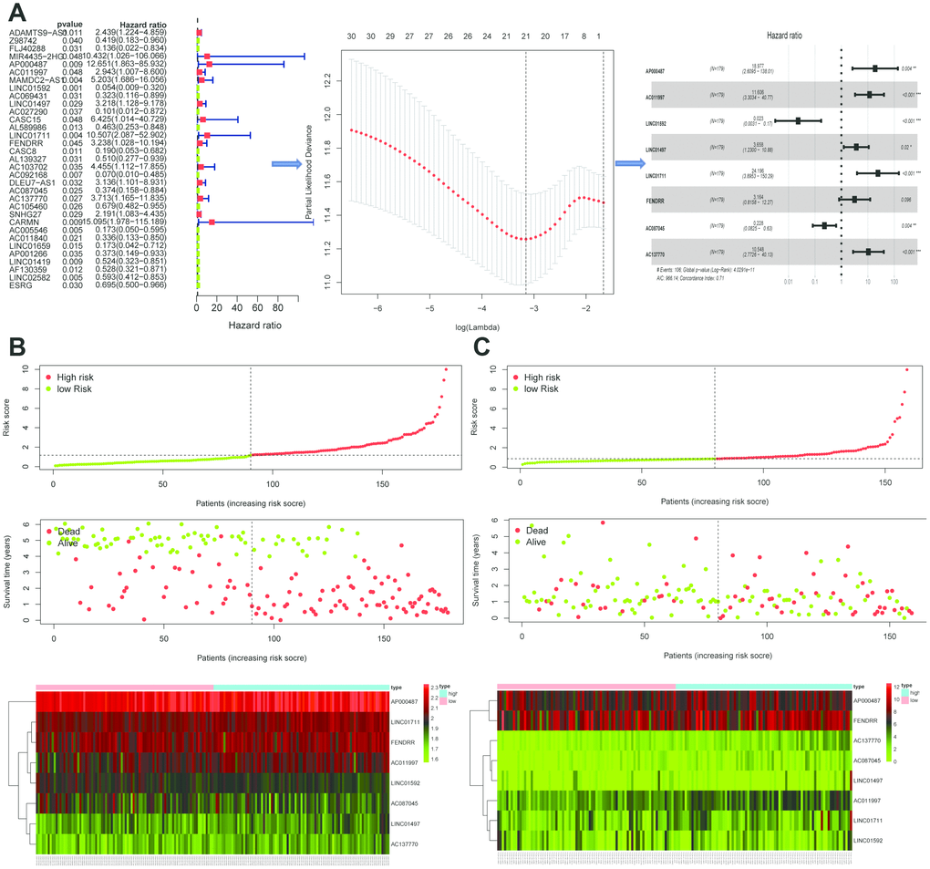 ESCC remains a serious burden on health system worldwide. Traditional algorisms such as tumor-node-metastasis (TNM) staging system failed to consider the genetic alterations of ESCC. Thus, in view of the high heterogeneity of ESCC, investigation of novel biomarkers and models is necessary. Recently, lincRNA-based signatures have received much focus and revealed excellent potential in prognosis prediction of numerous cancers [10, 11].