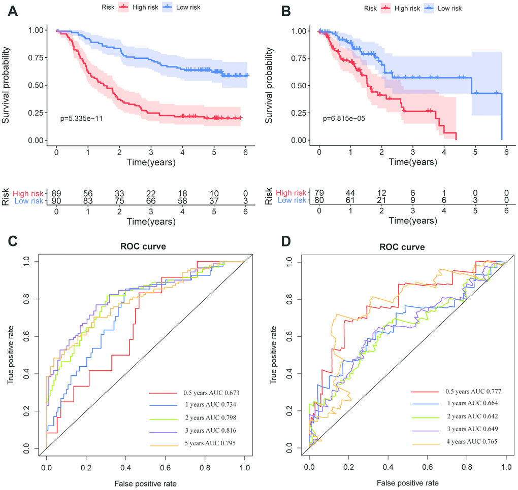 The DELs of the training set (GSE53625) were exposed to univariate COX regression and 33 DELs related to the OS (P < 0.05) were measured as predictive lincRNAs for LASSO analysis (Table 1). Finally, eight lincRNAs were selected to construct a risk signature for ESCC using multivariate COX regression. The risk score of the signature for OS was identified: risk score = 18.977 × (expression level of AP000487) + 11.606 × (expression level of AC011997) + 0.023 × (expression level of LINC01592) + 3.658 × (expression level of LINC01497) + 24.196 × (expression level of LINC01711) + 3.164 × (expression level of FENDRR) + 0.228 × (expression level of AC087045) + 10.548 × (expression level of AC137770). As above, it was suggested that the lncRNAs in the signature were all risk factors for OS. Their coefficients indicated their impact on OS prediction. For example, the influence of LINC01711 was greatest while that of LINC01592 was least. All patients were separated to high- and low-risk sets based on median risk score in the GEO (Figure 2B) and TCGA (Figure 2C) cohorts. The patients’ status, survival time, and lincRNA expression levels are shown in Figure 2B (GEO) and 2C (TCGA). The survival analysis presented that the OS of low-risk set was better than that of high-risk set in the GEO cohort (hazard ratio, HR = 3.79, 95% confidence interval, 95% CI [2.56-5.62]; P < 0.001) (Figure 3A). The results were consistent in the TCGA cohort (HR = 2.73, 95%CI [1.65-4.53]; P < 0.001) (Figure 3B). The area under the ROC curve (AUC) for 0.5-, 1-, 3-, and 5-year OS were 0.673, 0.734, 0.798, 0.816, 0.795 and 0.777, 0.644, 0.642, 0.649, 0.765 in the TCGA and GEO cohorts, respectively. Together, it was indicated that the signature showed an excellent performance for OS prediction.