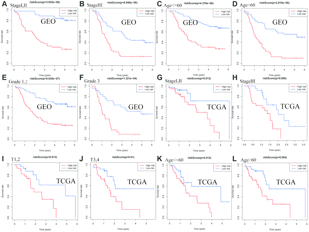 As shown in Figure 4, the risk score identified by prognostic signature assists as a helpful biomarker for OS prediction in different subgroups, including stage I,II (P < 0.0001), stage III (P < 0.0001), age≤60 (P < 0.0001), age > 60 (P < 0.0001), grade1,2 (P < 0.0001), grade 3 (P < 0.0001) in the GEO cohort, and stage I,II (P = 0.012), stage III (P = 0.006), T1,2 (P = 0.013), T3,4 (P = 0.01), age ≤ 60 (P = 0.012), age > 60 (P = 0.004) in the TCGA cohort, respectively.