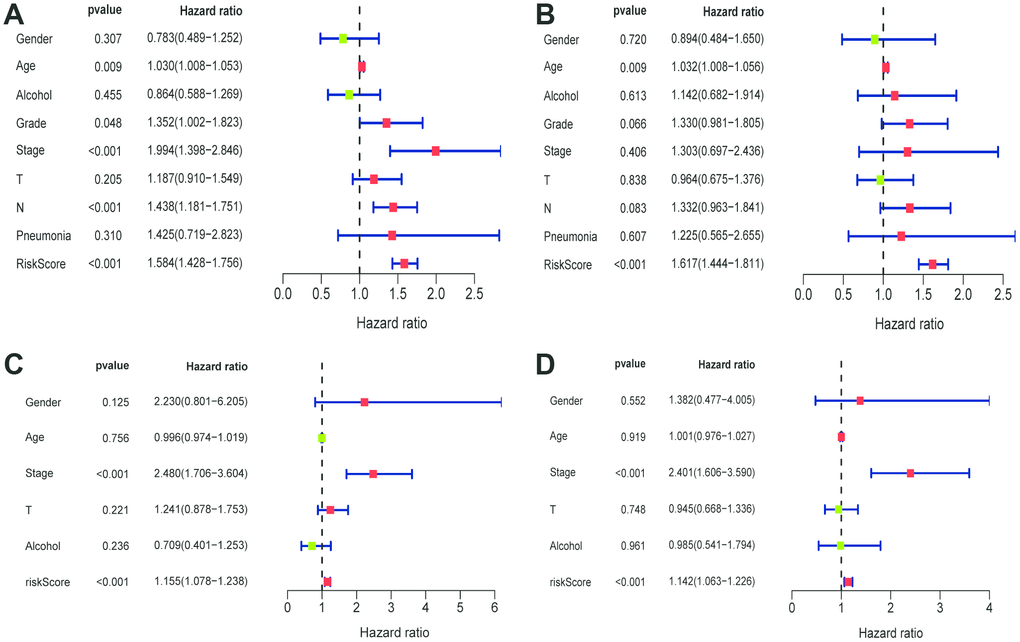 The univariate Cox regression showed that grade, stage, N stage and risk score in the TCGA cohort (grade: P =0.048, stage: P < 0.001; N stage: P < 0.041, risk score: P < 0.001; Figure 5A), and stage, risk score in the GEO cohort (stage: P < 0.001; risk score: P < 0.001; Figure 5C) were predictors for OS. Moreover, multivariate Cox regression analysis confirmed that age (HR = 1.032, 95% CI [1.008–1.056]; P = 0.009; Figure 5B) and risk score (HR = 1.617; 95% CI [1.444–1.811]; P < 0.001; Figure 5B) were significant independent risk factors in the TCGA cohort. Multivariate Cox regression further showed that stage (HR = 2.401, 95% CI [1.606–3.590]; P < 0.001; Figure 5D) and risk score (HR = 1.142; 95% CI [1.063–1.226]; P < 0.001; Figure 5D) was significant independent risk factors in the GEO cohort. These data indicated that the signature was an independent risk factor of ESCC.