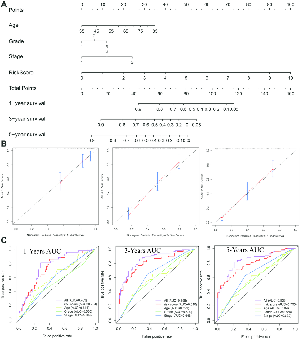 Based on the prognostic signature and clinical factors, such as age, grade and stage, a nomogram was constructed (Figure 6A). The calibration curve was used to describe the prediction value of the nomogram and the 45-degree line indicated the actual survival outcomes. The results for predicting 1-, 3- and 5-year OS showed that the nomogram-predicted survival closely matched with the best prediction performance (Figure 6B). The 1-year AUC was 0.734 for nomogram, and 0.611 for age, 0.530 for grade, 0.584 for stage. The 3-year AUC was 0.816 for nomogram, and 0.591 for age, 0.600 for grade, 0.646 for stage. Moreover, the 5-year AUC was 0.795 for nomogram, and 0.589 for age, 0.584 for grade, 0.639 for stage. These findings showed that compared with a single clinical factor, the nomogram combined the signature and clinical factors had great predictive accuracy.
