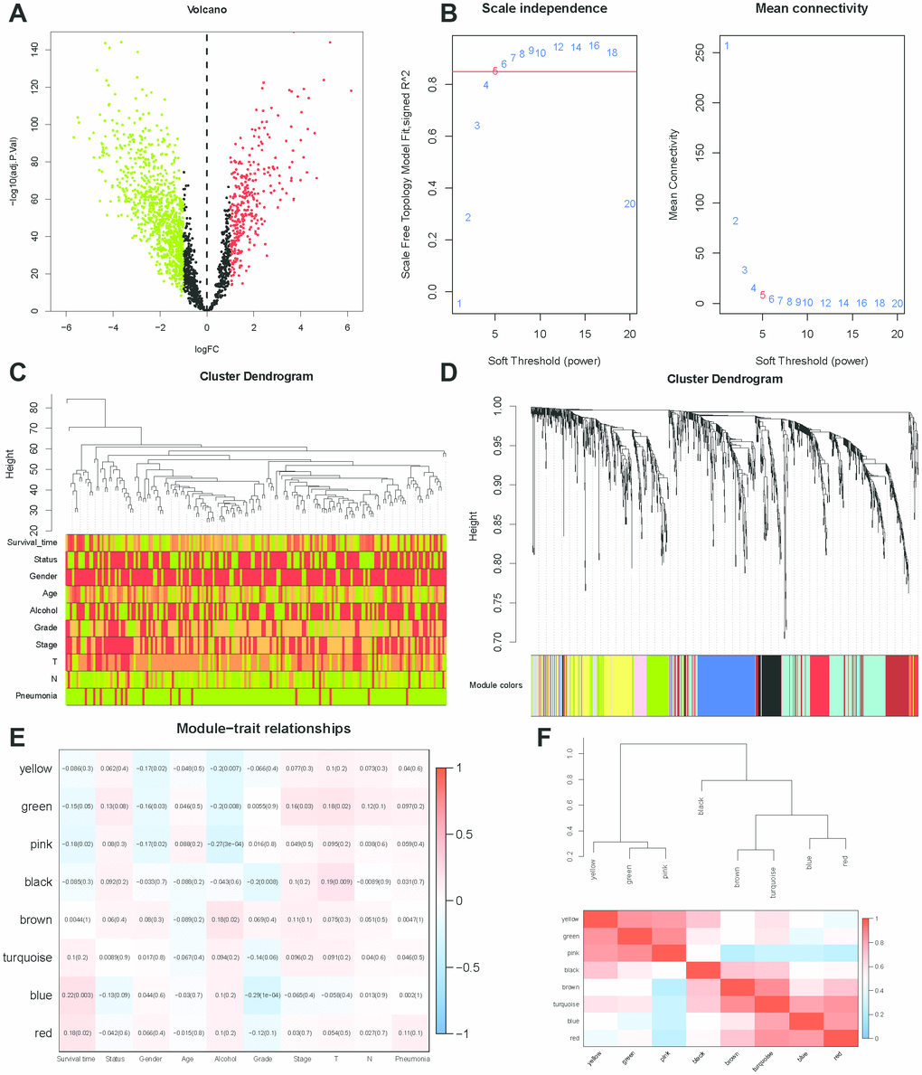 WGCNA is a useful tool to establish the co-expression network between gene pattern and clinical factors using R package “WGCNA” (Version: 1.68). The procedure of WGCNA included identifying gene expression similarity matrix, adjacency matrix and co-expression network. ScaleFree plot was used for evaluating whether the network exhibits a scale free topology. The power value of soft threshold of adjacency matrix was identified as 5 to meet scale-free topology criterion. The hierarchically clustering analysis based on average-linkage were originated from the Dynamic using Tree Cut method for Branch Cutting (deep-split = 2, cut height = 0.4, minimum cluster size = 30). The association between modules and variables was identified to select relevant module.