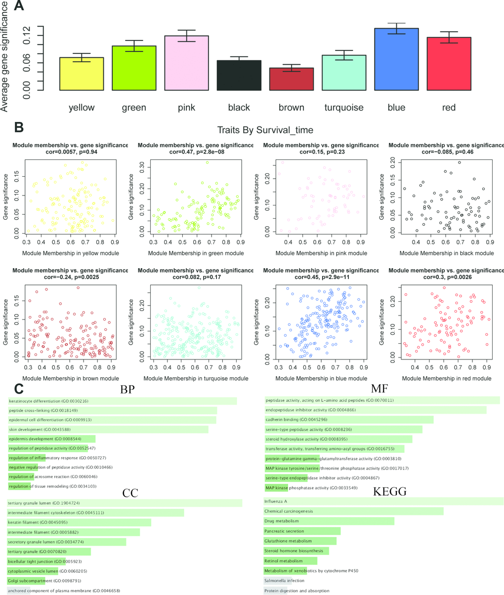 WGCNA was used to develop a gene co-expression system to select biologically meaningful gene modules which are related to the lincRNAs in the signature. We set the cut-off as Person correlation coefficient > 0.6 and P < 0.001 to screen genes co-expression with lincRNAs. Then, differential expressed gene (DEG) analysis was performed among these genes. Figure 7A shows the volcano plot of DEGs. To create a scale-free system, the scale-free topology fit index reached 0.8 by setting the soft threshold power value beta to 5 (Figure 7B). In addition, genes with similar patterns was located in different modules by average linkage clustering (Figure 7C). The minimum cluster size was identified as 30 per module. The dynamic shear method was performed to determine the gene module. We calculated module eigengene (ME) which was the overall gene expression level of corresponding modules and clustered them based on their correlation in order to explore co-expression similarity of all modules (Figure 7D). To analyze the connection of gene modules and clinical characteristics, eigengenes were calculated correlations with clinical factors, such as survival time, status, gender, age, alcohol, grade, stage, T, N, pneumonia. Finally, the robust correlation was identified between the gene significance and the survival time, T stage (Figure 7E). The eight modules were generally separated into two clusters (Figure 7F). Gene significance were also determined to evaluate the correlation between gene expression and survival time (Figure 8A). To further analyze genes in these modules, we found a strong correlation between the gene significance for the survival time and Module Membership in the green module (cor = 0.47, P = 2.8e − 08), the brown module was negatively correlated with the survival time (cor = −0.24, P = 0.0025), the blue module was positively correlated with the survival time (cor = 0.45, P = 2.9e − 11), and the red module was positively correlated with the survival time (cor = 0.3, P = 0.0026) (Figure 8B). The function enrichment analysis was performed to explore the GO database and KEGG pathway in which are involved (Figure 8C). The results indicated that the biological process mainly involved in keratinocyte differentiation, peptide cross-linking, epidermal cell differentiation, and skin development and so on. The results showed that the molecular function was related to peptidase activity, acting on L-amino acid peptides, endopeptidase inhibitor activity, cadherin binding and serine-type peptidase activity. The cell components which was correlated to the results included tertiary granule lumen, intermediate filament cytoskeleton, keratin filament, and intermediate filament. Furthermore, KEGG pathway functional enrichment showed that influenza A, chemical carcinogenesis and drug metabolism were mainly related to the genes in these modules.