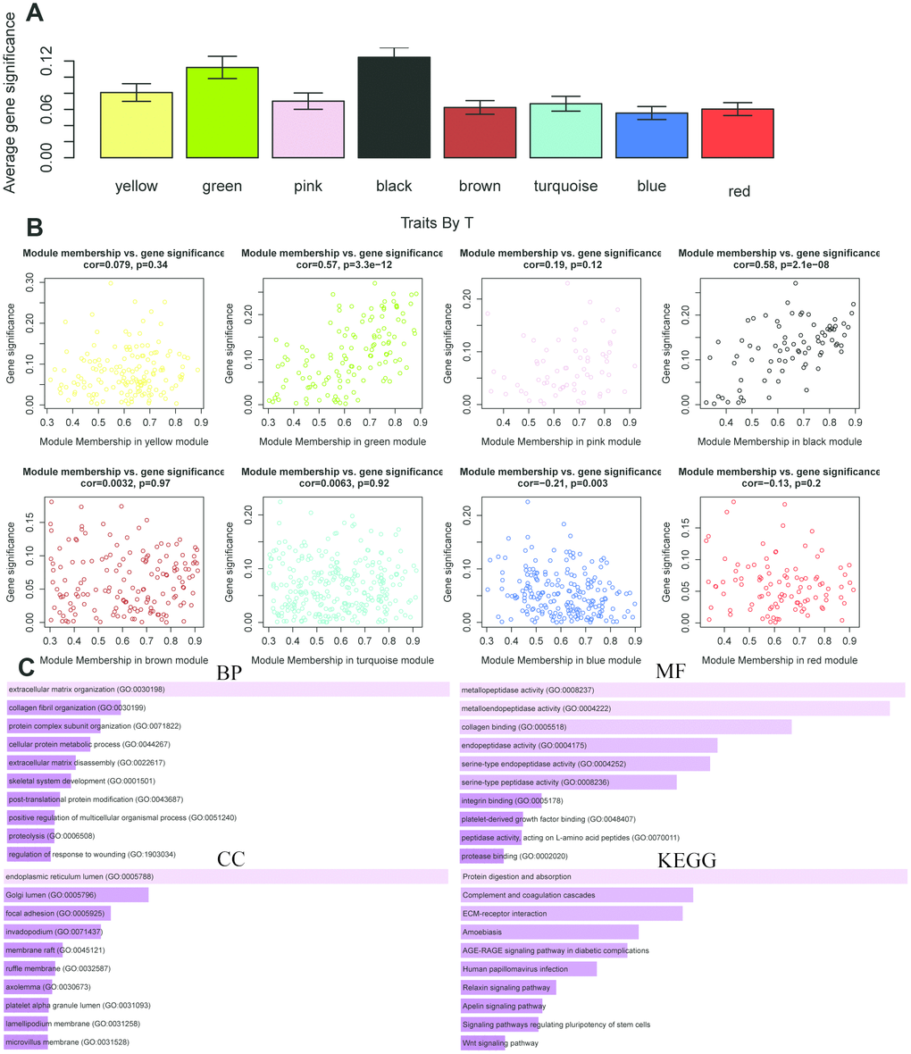 The same analysis was completed to assess the correlation between gene expression and T stage (Figure 9A). Thus, we found a strong correlation between the gene significance for the T stage and Module Membership in the green module (cor = 0.57, P = 3.3e − 12), the black module was positively correlated with the T stage (cor = − 0.24, P = 2.1e – 8), and the blue module was negatively correlated with the T stage (cor = 0.21, P = 0.003) (Figure 9B). The function enrichment analysis was also performed to explore the GO database and KEGG pathway in which are involved (Figure 9C). The results indicated that the biological process mainly involved in extracellular matrix organization. The results showed that the molecular function was related to metallopeptidase activity, metalloendopeptidase activity and collagen biding. The cell components which was mainly correlated to the results included endoplasmic reticulum lumen. Moreover, KEGG pathway functional enrichment showed that protein digestion and absorption was mainly related to the genes in these modules.