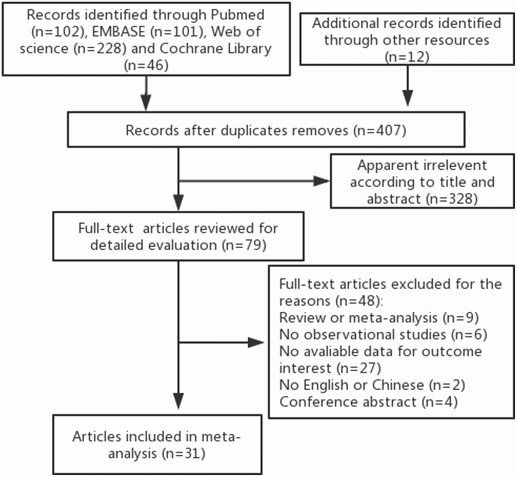 As illustrated in Figure 1, our initial search identified 407 potentially relevant citations from online databases and reference lists, from which 328 were excluded after screening the titles and abstracts. Ultimately, 31 articles met the inclusion criteria and were finally included in this meta-analysis [17–47]. This selection consisted of 18 articles designed as case-control studies and 13 articles designed as cohort studies, with approximately 3,352,264 participants. Moreover, these articles were regarded as independent studies since the role of antihypertensive medications in the risk of bladder/kidney cancer was assessed according to the different antihypertensive medications classes (ACEI, ARB, BB, CCB, diuretics or any antihypertensive medications), cancer sites (kidney, bladder), and gender. The characteristics of the articles are listed in Table 1. Data collection for antihypertensive medications use was not consistent across studies, with most using questionnaires or prescription database reviews. Cancer cases were ascertained by cancer registries or medical records from the included studies. Most studies controlled potential confounding factors (age, gender, BMI, smoking, hypertension) by matching or adjustments; however, inconsistencies among the adjustments in each study were observed. The scores of the Newcastle-Ottawa Scale (NOS) quality assessment ranged from 6 to 8 and are listed in Table 1.