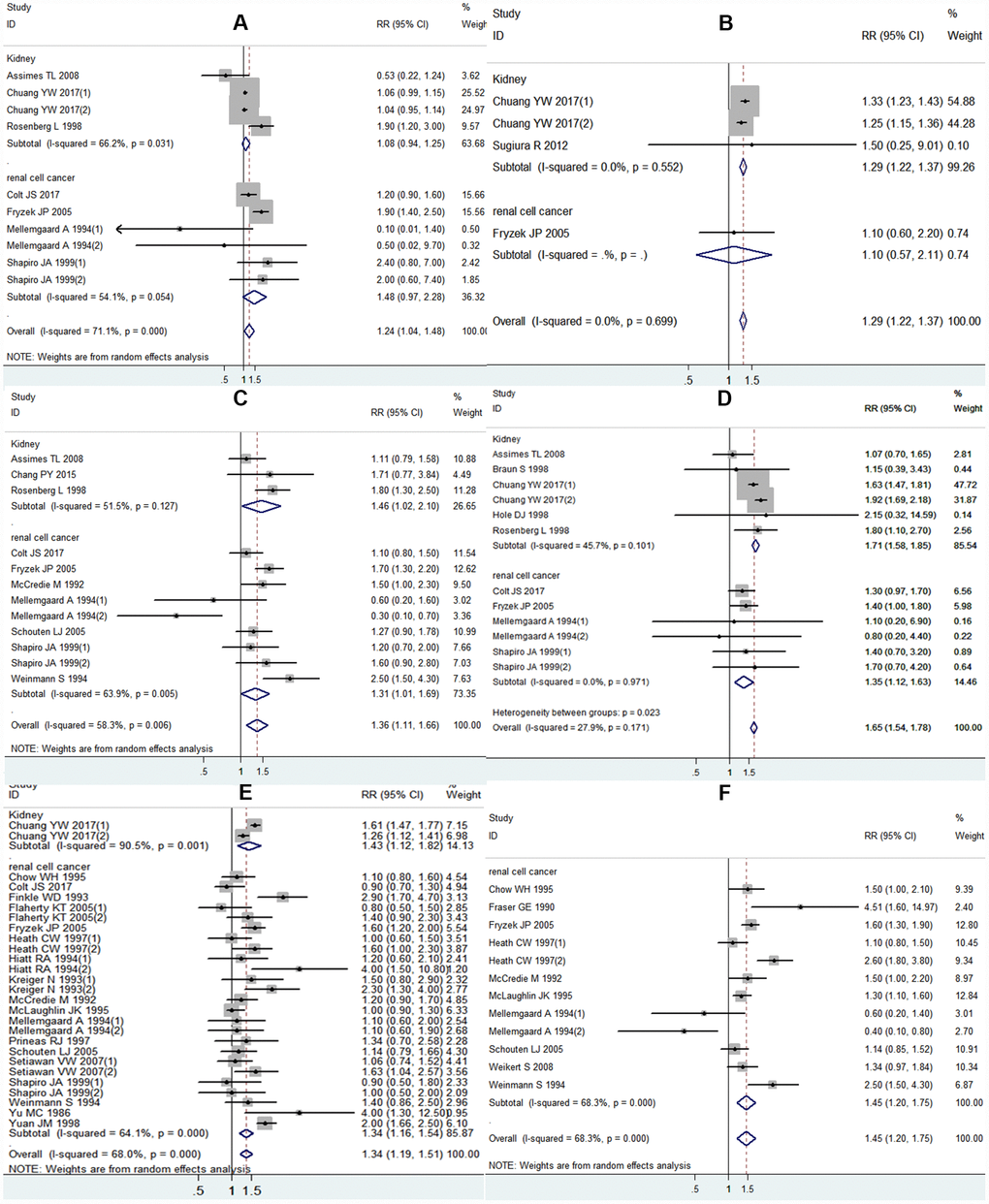 | All kidney | 10 | 1.24 (1.04, 1.48) | 71.1 | 0.000 | 4 | 1.29 (1.22, 1.37) | 0.0 | 0.699 | 12 | 1.36 (1.11, 1.66) | 58.3 | 0.006 | |||||||||||||||||||||||||||||||||||||||||||||||||||||||||||||||||||||||||||||||||||||||
