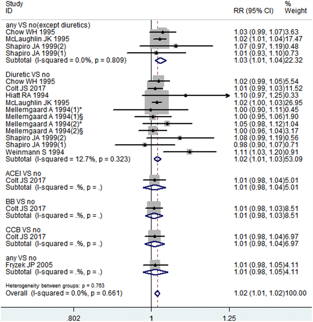 We used an RR with 95% CI to estimate the associations between each class of antihypertensive medications and bladder/kidney cancer risk. In order to explore whether gender, smoking, and hypertension affected this association, subgroup analyses were performed.