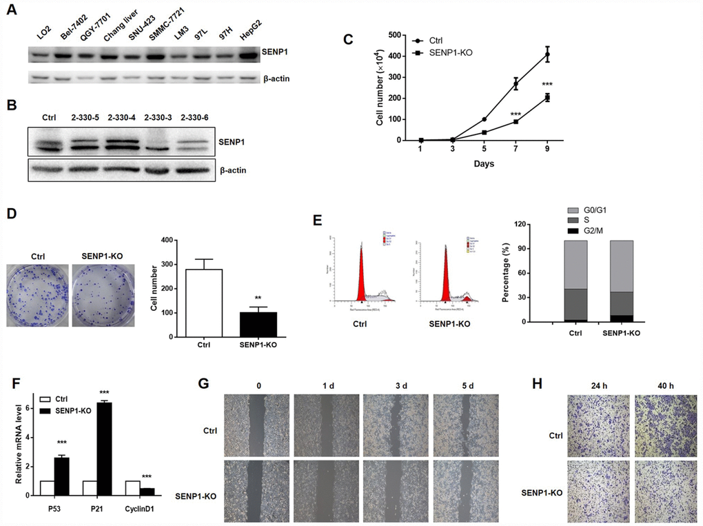 Effects of SENP1 knockout on HCC cell growth, cell cycle distribution, cell migration and invasion
