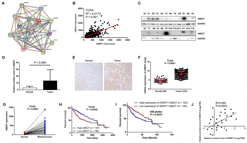 In order to further explore the underlying mechanism of the promotion effects on HCC by SENP1, String database was utilized to construct SENP1-related interaction network, indicating its potential association with UBE2T (Figure 3A). Furthermore, the positive correlation between expression of SENP1 and UBE2T in HCC, which was revealed based on data of TCGA, also proved the assumption (Figure 3B). Subsequently, to confirm the upregulation of UBE2T level in HCC and explore whether an association exists between SENP1 and UBE2T, Western blot analysis and immunohistochemical staining were employed to detect the expression level of UBE2T. As shown in Figure 3C, the results revealed significantly higher expression level of UBE2T in tumor tissues than para-carcinoma tissues (Figure 3D). As expected, the immunohistochemical staining showed the same trend as shown in Figure 3E. Actually, the data collected from TCGA database also proved the upregulation of UBE2T in tumor tissues (50 normal tissues vs. 374 tumor tissues, or 50 normal tissues vs. 50 matched tumor tissues, P < 0.001, Figure 3F and 3G). Moreover, the association between high expression of UBE2T or simultaneously high expression of UBE2T and SENP1 with lower survival rate was showed by TCGA database and KM plotter liver cancer dataset (Figure 3H and 3I). More importantly, through Pearson correlation of the corresponding expression level of SENP1 and UBE2T in tumor tissues and related para-carcinoma tissues, we also established the positive correlation between the expression level of SENP1 and UBE2T (R = 0.595, P = 0.0022, Figure 3J), which is also in consistent with our previous speculation.