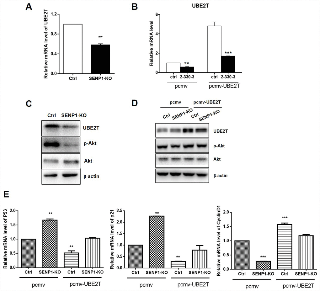 In view of the fact of UBE2T overexpression in HCC and positive correlation between SENP1 and UBE2T, we were wondering whether a direct interaction exists between SENP1 and UBE2T. Bearing these in mind, PCMV-UBE2T plasmid was constructed and co-expressed with negative control or SENP1 knockout for overexpression of UBE2T, while the vector PCMV was used as the negative control. Figure 4A–4C showed that SENP1 knockout inhibited the protein level of UBE2T, which could be reversed by UBE2T overexpression. It has been reported that UBE2T could activate Akt signaling pathway [23]. Herein, as shown in Figure 4C and 4D, activation of Akt, as well as the expression of p- Akt, was also found to be significantly inhibited by SENP1 knockout which also could be reversed by overexpression of UBE2T. As described above, SENP1 knockout significantly enhanced P53 and P21 levels, and reduced CyclinD1 levels. Herein, the opposite effect of UBE2T overexpression was verified again based on the expression levels of P53, P21 and CyclinD1 (Figure 4E).