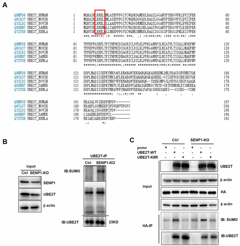 A commonly known SUMO acceptor site consists of the sequence ΨKXE (Ψ, a large hydrophobic amino acid; K, the site of SUMO conjugation; X, any amino acid) [16]. We found that UBE2T contains the SUMOylation site (KRE) via sequence alignment and bioinformatics analysis by the software SUMOplot and SUMOsp, thus we speculated that UBE2T could be SUMOylated [26] (Figure 5A). Therefore, we investigated whether the induction of UBE2T by SENP1 results from deSUMOylation. Our results showed that SENP1 knockout could enhance the SUMOylation of UBE2T via increasing SUMO-UBE2T complex (Figure 5B). Based on the fact that K8 site is the major acceptor sites for SUMOylation which is also proved to be universal via comparative analysis of UBE2T in different species (Figure 5A), we generated the mutated UBE2T gene (K8R) by which K was mutated to R to further determine SENP1-mediated deSUMOylation of UBE2T. PCMV-HA, PCMV-UBE2T-WT (wild-type), and a SUMO-defective mutant, PCMV-UBE2T-K8R were co-expressed with the negative control or SENP1 knockout group. As expected, SUMOylated UBE2T could be detected for UBE2T-WT, but not for the UBE2T-K8R, verifying the validity of the SUMOylation site (KRE) again. More importantly, the increased SUMOylation of UBE2T in SENP1 knockout group compared with the negative control proved the ability of SENP1 to deSUMOylate UBE2T (Figure 5C).