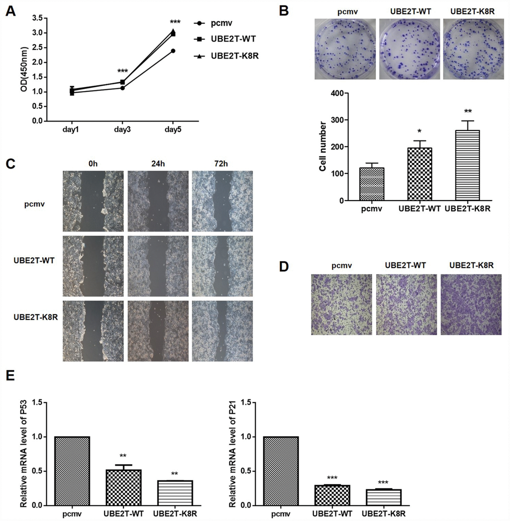 Effect of UBE2T overexpression and K8R mutation on cell function and its downstream signaling pathway