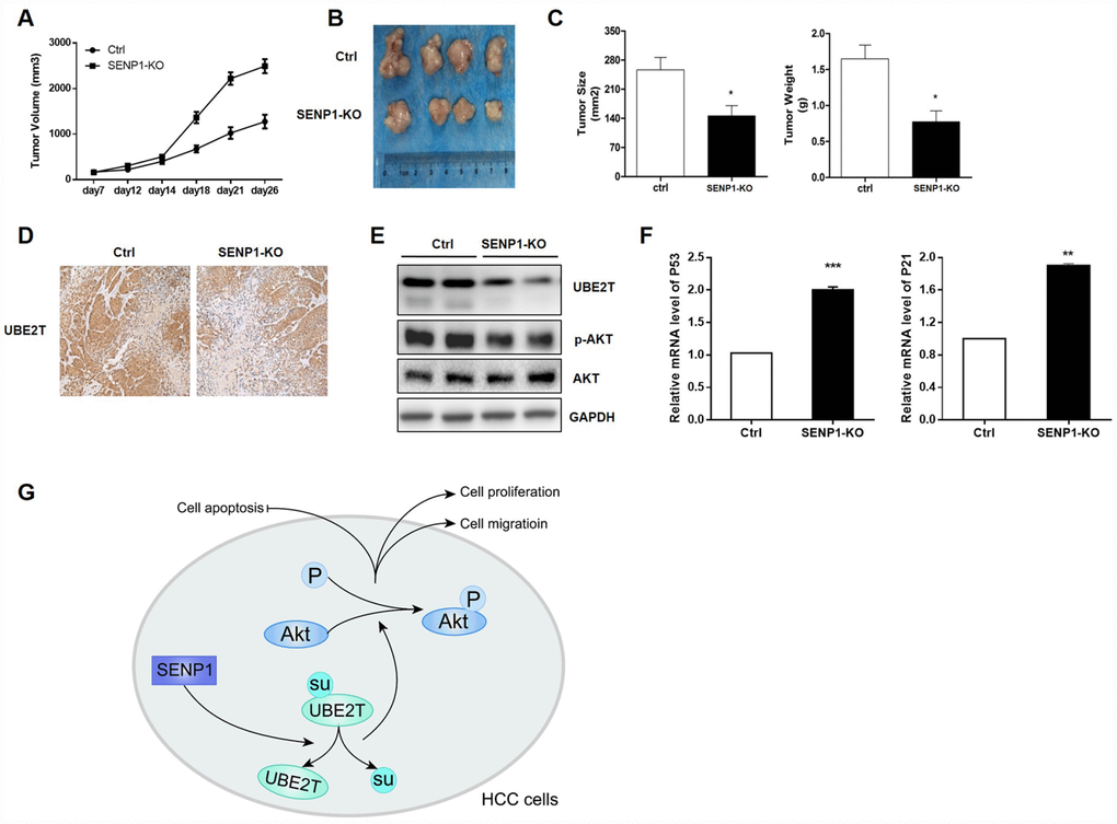 In order to verify the effects of SENP1 knockout on tumor growth in vivo, tumor-bearing mice model was constructed by injection of HepG2-SENP1-KO cells The trend of tumor growth showed significant slowdown in the SENP1-KO group than the negative control (Figure 7A). Accordingly, the final tumor size and weight in SENP1-KO group was significantly reduced compared with the negative control (Figure 7B and 7C). Therefore, this xenograft study verified the important role of SENP1 in driving tumor growth in vivo. Furthermore, the results of IHC and Western blot analysis confirmed the suppressed expression of UBE2T in SENP1-KO mice (Figure 7D and 7E). Meanwhile, is was also showed that SENP1 knockout blocked the activation of Akt (Figure 7E). In addition, the mRNA levels of cell cycle related proteins, P53 and P21 were increased in SENP1-KO group compared with control group (Figure 7F). Notably, all the results in vivo were in accordance with the in vitro results obtained before. Altogether, the molecular mechanism of SENP1 mediated promotion of HCC was summarized in Figure 7G.