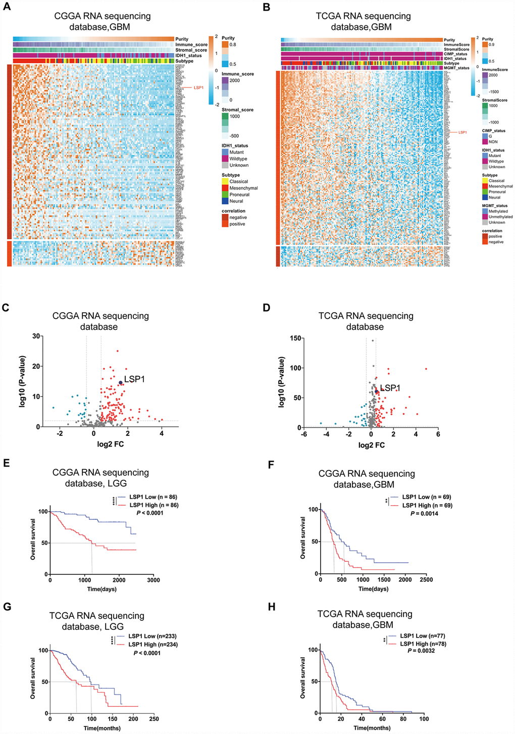 In conclusion, according to clinical samples, and multiple dataset profiles, we first revealed an elevated LSP1 expression in GBM compared to LGG. Second, we confirmed the correlation between upregulated LSP1 expression and unfavorable patients’ survival, and increased LSP1 expression was associated with the progressive malignancy in diffuse glioma. Third, we showed the potential of LSP1 as a molecule to predict the response of GBM patients to radiotherapy and chemotherapy. Finally, we find a previous undefined role of LSP1 in the regulation of local immune response in GBM which may contribute to the high lethality of GBM. This may disclose a new aspect to explain the “cold” status of GBM. Taken together, these findings imply the potential of LSP1 as a candidate target in developing novel immune strategies against glioma. Our study may contribute to improving the understanding of the properties and functions of TME in GBM, and help to develop new treatment strategies against glioma.