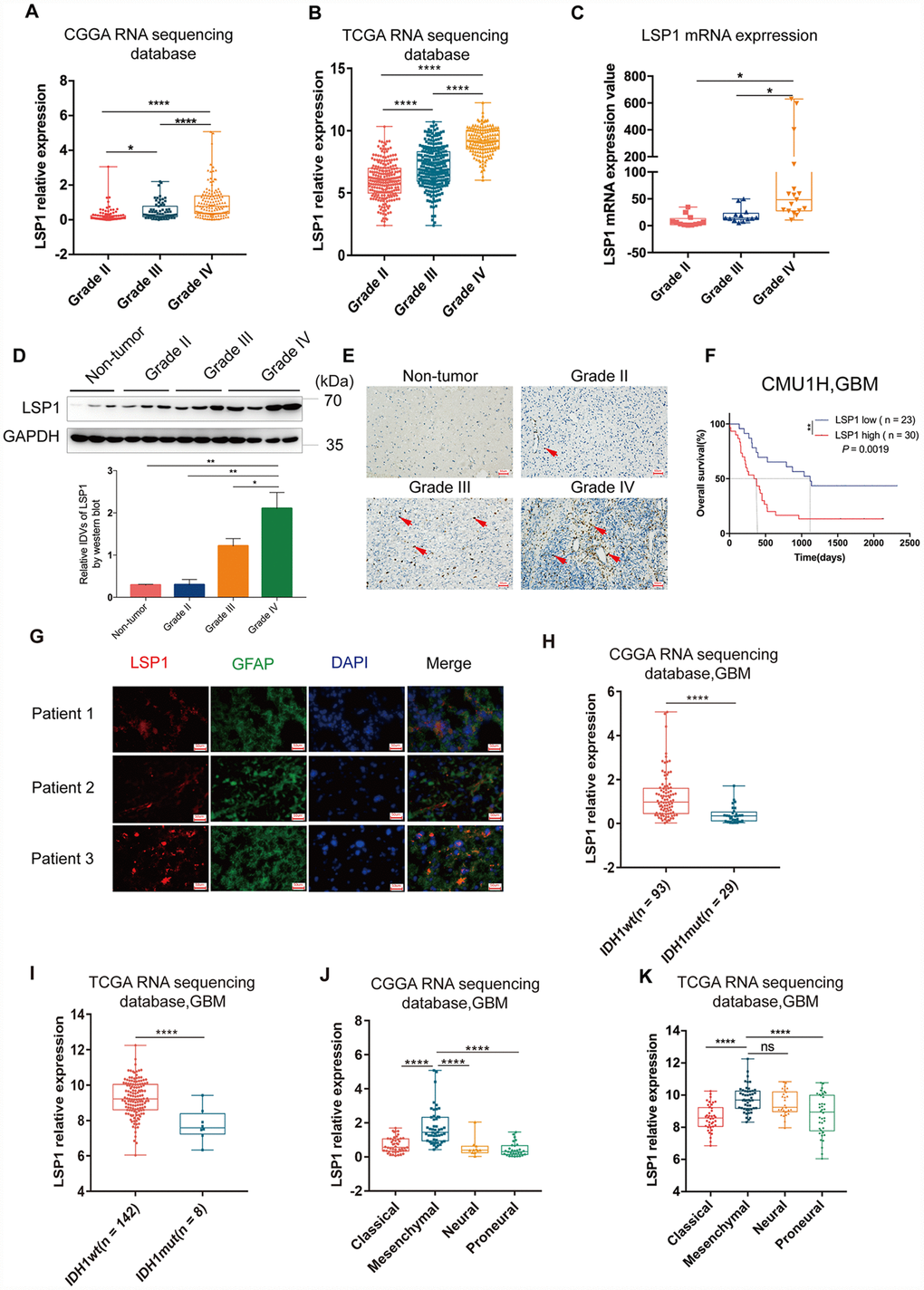 Next, investigation was performed with IDH mutation status as a sub-classifier. Mutation in IDH1 is a stable marker for better prognosis in both lower-grade glioma (LGG) and glioblastoma multiforme (GBM) [29]. As the earliest detectable genetic alteration in gliomagenesis, IDH1 heterozygous missense mutations in codon 132 cause an arginine-to-histidine substitution in 80–90 % of cases (R132H) [30] that leads to a distinct metabolism and hypermethylation phenotype in gliomas [31]. IDH1 mutations caused down-regulation of leukocyte chemotaxis, resulting in repression of the tumor-associated immune system [32]. Given that significant infiltration of immune cells such as macrophages, microglia, monocytes, lymphocyte, and neutrophils is linked to poor prognosis in many cancer types, these disrupted immune infiltrates in IDH1 mutation glioma tumors may contribute to the different aggressiveness of these two glioma types. Therefore, we compared LSP1 expression between IDH1 mutation and wild type. The result indicated that GBM with wild type IDH1 presented a higher level of LSP1 expression (Figure 2H, 2I and Supplementary Figure 2C–2E). This suggested that elevated LSP1 expression was more common in IDH1 wild-type glioma and further reflected different biological genetic background between these two kinds of tumors. Moreover, we found that mesenchymal GBM exhibited a higher expression level of LSP1 than another three subtypes (proneural, classical, and neural) (Figure 2J, 2K and Supplementary Figure 2F–2H). We further employed ROC curve and AUC measurement to examine the sensitivity and specificity of LSP1 as a marker for mesenchymal GBM. The result confirmed the potential of LSP1 to distinguish mesenchymal subtype in GBM (Supplementary Figure 2I, 2J). Altogether, these findings indicated that LSP1 expression was elevated in GBM, especially in IDH1 wild type and mesenchymal subtype tumors.