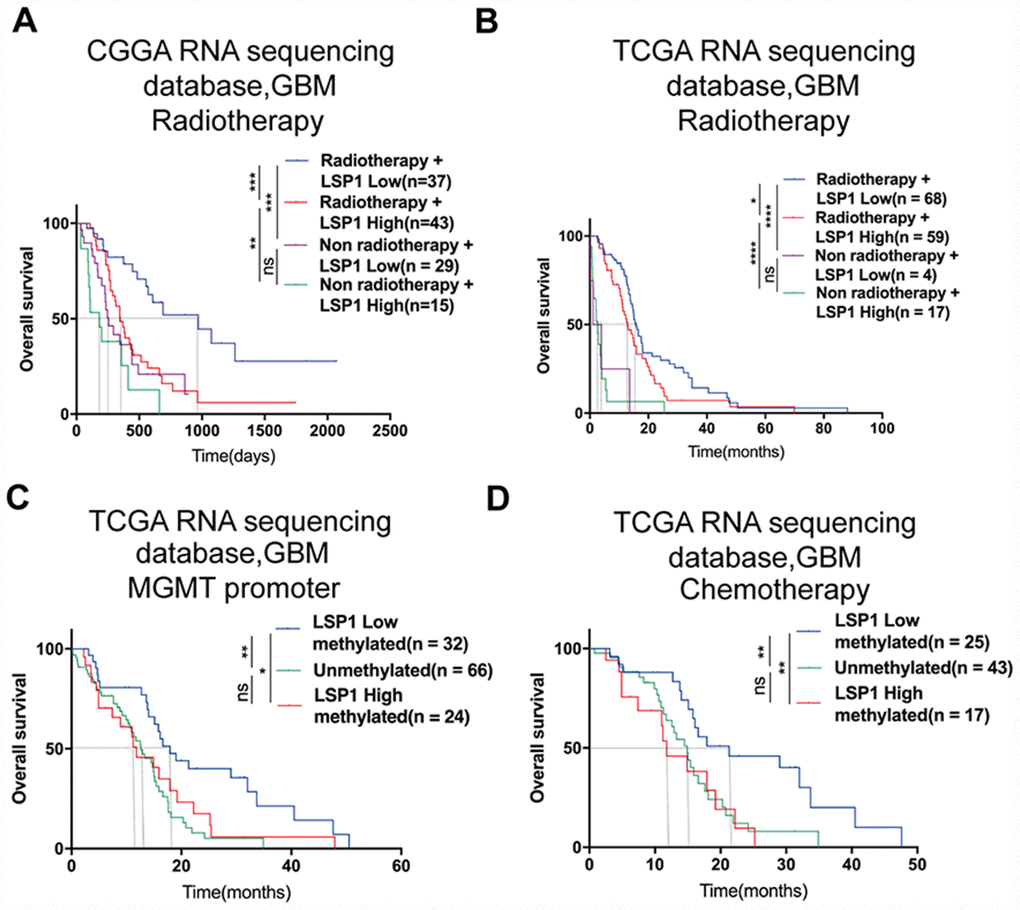 Previous studies indicated that LSP1 expression was associated with malignant biologic process in malignancies like breast cancer and Hodgkin’s disease [33, 34]. Since these malignant biological behaviors have been reported to contribute to radiotherapy and chemotherapy resistance [35], we employed multivariate Cox regression and survival analyses to examine whether LSP1 could serve as a marker for the prediction of the response to radiotherapy and chemotherapy in GBM patients. The result of multivariate Cox regression analysis revealed that LSP1 expression was significantly associated with the survival of GBM patients with radio- and chemo-therapy (Supplementary Table 6). Moreover, according to treatment strategies (whether to receive radiation therapy) and LSP1 expression, we divided the samples in CGGA and TCGA into four groups, including high LSP1 expression with or without radiotherapy and low LSP1 expression with or without radiotherapy. We found that no matter whether LSP1 expression in GBM patients was high or low, patients receiving radiotherapy had a longer survival times compared to those without radiotherapy (Figure 3A, 3B and Supplementary Figure 3A, 3B). But the low LSP1 group had a survival advantage compared to high group in GBM patients receiving radiotherapy, but not those without radiotherapy (Figure 3A, 3B and Supplementary Figure 3A, 3B). This suggested that LSP1 might participant in mediating radiotherapy resistance in GBM patients. O6-methylguanine-DNA methyltransferase (MGMT) promoter methylation has been identified as a predictive marker for GBM patients treated with temozolomide (TMZ) chemotherapy, and Higher level of MGMT promoter unmethylation lead to TMZ resistance [36]. The analyses of LSP1 expression in three TCGA GBM datasets did not show consistent results between MGMT promoter methylated and unmethylated group. LSP1 had a higher expression in MGMT promoter unmethylated group in two microarray datasets, but not in RNA sequencing dataset (Supplementary Figure 3C–3E). We further analyzed the association between LSP1 expression and the survival of GBM patients with different MGMT promoter status. Based on MGMT promoter status and LSP1 expression, the samples in TCGA were divided into three groups, including MGMT promoter methylated with high or low LSP1 expression and MGMT promoter unmethylated. The result showed that the low LSP1 group had a survival advantage compared to high group with methylated MGMT promoter (Figure 3C and Supplementary Figure 3F, 3G). In contrary, there was no survival difference between MGMT promoter unmethylated and methylated group with higher expression of LSP1, which suggested higher expression of LSP1 could eliminate the prognosis advantage of MGMT promoter methylation (Figure 3C and Supplementary Figure 3F, 3G). Lastly, the analyses with the data from three TCGA datasets showed that high LSP1 expression with methylated MGMT promoter had no significant survival advantage over unmethylated group in chemotherapy patients (Figure 3D and Supplementary Figure 3H, 3I). This suggested that LSP1 mediating chemotherapy resistance in GBM may be closely related to MGMT promoter methylation. Collectively, these data indicate that LSP1 could serve as a molecule for the response prediction to radiotherapy and chemotherapy in GBM.