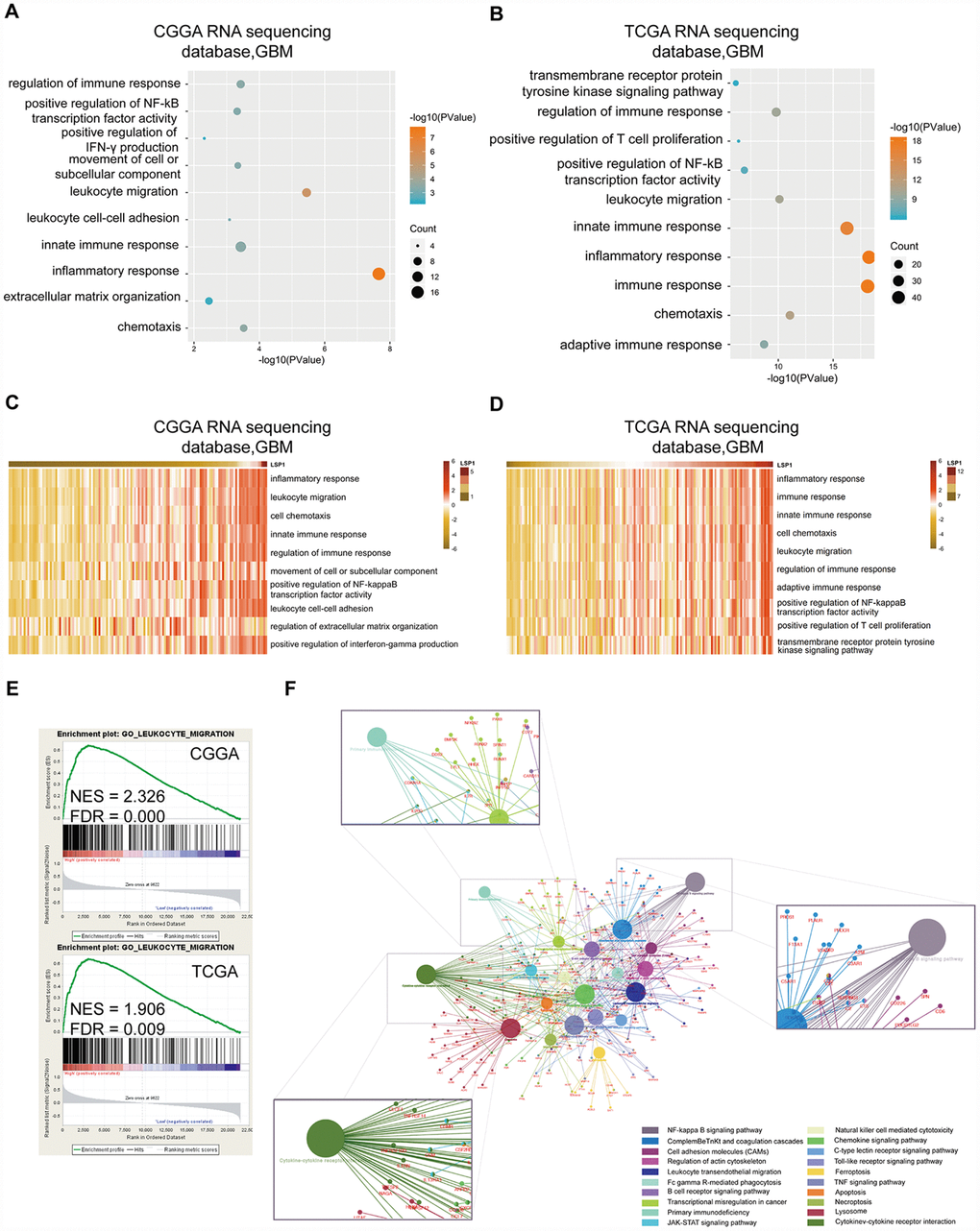 Next, we focus on exploring the functional role of LSP1 in GBM. A list of genes positively correlated with LSP1 expression (Pearson r > 0.5, and P < 0.05) was obtained from CGGA and TCGA GBM RNA sequencing datasets, respectively (Supplementary Table 7). GO analysis was performed based on this gene list. And the result showed that genes most relevant to LSP1 were mostly involved in the regulation of leukocyte migration, immune response, and inflammatory response (Figure 4A, 4B). While genes that negatively correlated with LSP1 expression (r < -0.4, and P < 0.05) contributed to the regulation of normal biological process, such as brain and spinal cord development (Supplementary Figure 4A, 4B). Additionally, in consistent with the above data, the results of GSVA showed the enrichment of leukocyte migration, inflammatory response, and the regulation of immune response phenotypes in samples with high LSP1 expression (Figure 4C, 4D). GSEA also demonstrated a close association between LSP1 expression and the regulation of leukocyte migration, inflammatory response, and immune response in GBM (Figure 4E and Supplementary Figure 4C, 4D). Moreover, we summarized the overlapping up-regulated genes correlated with high LSP1 expression in CGGA and TCGA RNA sequencing datasets (Pearson r > 0.3, and P < 0.05). There were 892 overlapping up-regulated genes (Supplementary Table 8). As shown in Figure 4F, the result of KEGG pathway analysis showed that LSP1 was significantly correlated to immune related pathways, such as leukocyte trans-endothelial migration, NF-kappa B signaling pathway, cytokine-cytokine receptor interaction, and primary immunodeficiency. These findings imply that LSP1 may play an important role in regulating immunologic biological processes of GBM.