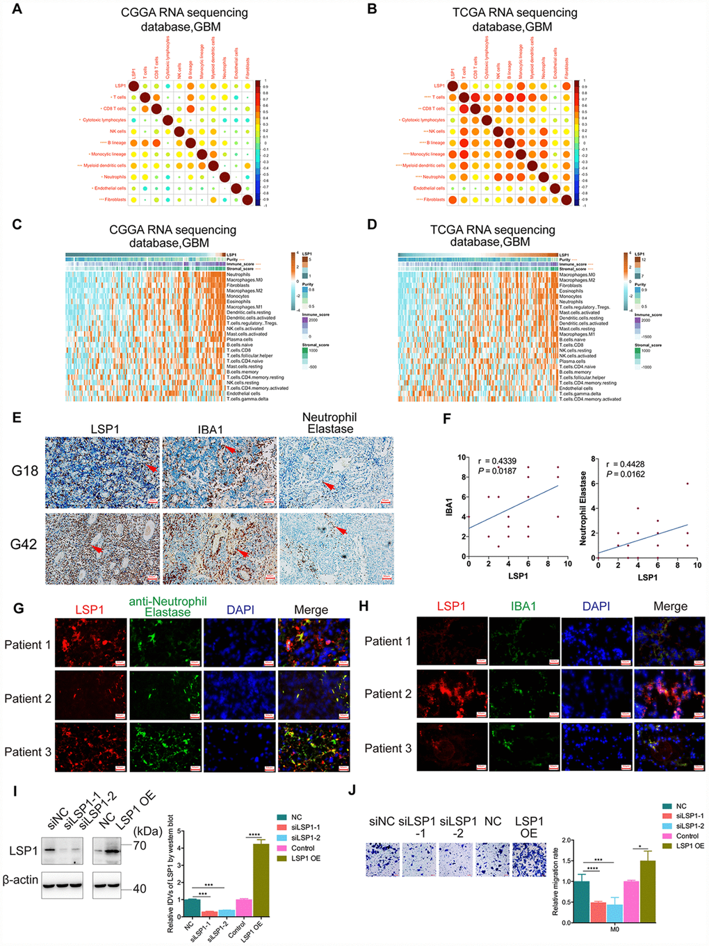 Additionally, TAMs in GBM are monocyte-derived macrophages from peripheral blood. Macrophages can be categorized into M1 and M2 subtypes based on their polarization status. Glioma cell could recruit M2 tumor-associated macrophages and promote their growth [38]. Furthermore, our previous research revealed that macrophage and neutrophil indicated poor prognosis in glioma patient [39]. Thus, we further performed IHC staining of LSP1, IBA1 (macrophage marker) and Neutrophil Elastase (neutrophil marker) in 29 clinical GBM samples. There were73.33% (11/15) high macrophage and 66.67% (10/15) high neutrophil infiltrated in LSP1-high GBM tissue samples. Simultaneously, 71.43% (10/14) low macrophage infiltration and 64.29% (9/14) low neutrophil infiltration in LSP1-low GBM tissue (Figure 5E, 5F). Moreover, the result of immunofluorescence colocalization confirmed that LSP1 was expressed in neutrophils and macrophages in GBM tissue (Figure 5G, 5H). This matched the above results of GO analysis, GSVA and GSEA. We further investigated the level of LSP-1 expression in glioma cells (U87, LN229, T98, and PGC21) and non-tumor cells (NHA, THP1(M0), THP1 induced M1 and M2 cells, and PBMC). The results showed that the expression levels of LSP1 in THP1(M0), M1 and M2 macrophages induced from THP1 cells, and PBMC were significantly higher than that in tumor cells (Supplementary Figure 5A, 5B). Thus, we proposed that LSP1 mainly functioned with non-tumor cell population in GBM. Based on this observation, we investigated the effect of LSP1 in M0 macrophages induced from THP1 cells on GBM migration abilities. As shown in Figure 5I and 5J, LSP1overexpression in M0 macrophages induced from THP1 cells increased their migration abilities. But LSP1 overexpression in U87 and PGC21 (a primary adherent glioma cell line from a clinical GBM sample) glioma cells didn’t increased their migration abilities (Supplementary Figure 5C, 5D). Together, these results indicate that LSP1 might contribute to the immunosuppressive response in GBM, and regulate the behaviors of immune cells like macrophages (M2).
