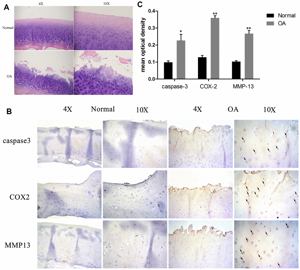 Normal and OA articular cartilage samples were used for histological and immunohistochemical analysis. As Figure 1A shows, the H&E staining revealed that cartilages in the OA samples were degraded severely (surface wear, matrix fissuring, and decreased number of chondrocytes) compared to normal tissues. As per the IHC results (Figure 1B and 1C), the signal of MMP-13, a well-known cartilage degradation-related protein, was remarkably increased. Similarly, the apoptosis-related protein caspase-3, and the inflammatory-related marker COX-2 were also significantly increased. These results indicated that cartilage degradation, apoptosis, and inflammation were evident in the OA samples as compared to the normal samples.