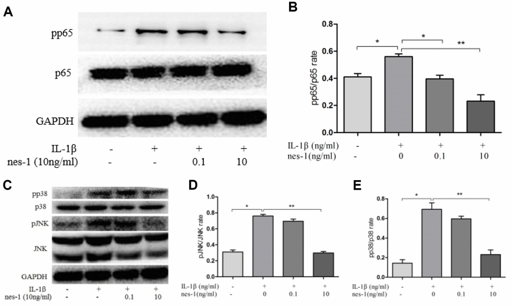 The MAPK signaling pathway plays an important role in the pathophysiology of OA, especially in the regulation of MMPs expression. Previous studies have shown that nesfatin-1 can affect the activation of MAPK. Thus, the effects of nesfatin-1 on MAPK in IL-1β-stimulated chondrocytes were investigated. Phosphorylation of p38 and JNK was increased by IL-1β stimulation, while it was inhibited by the treatment with nesfatin-1 (Figure 10C–10E).
