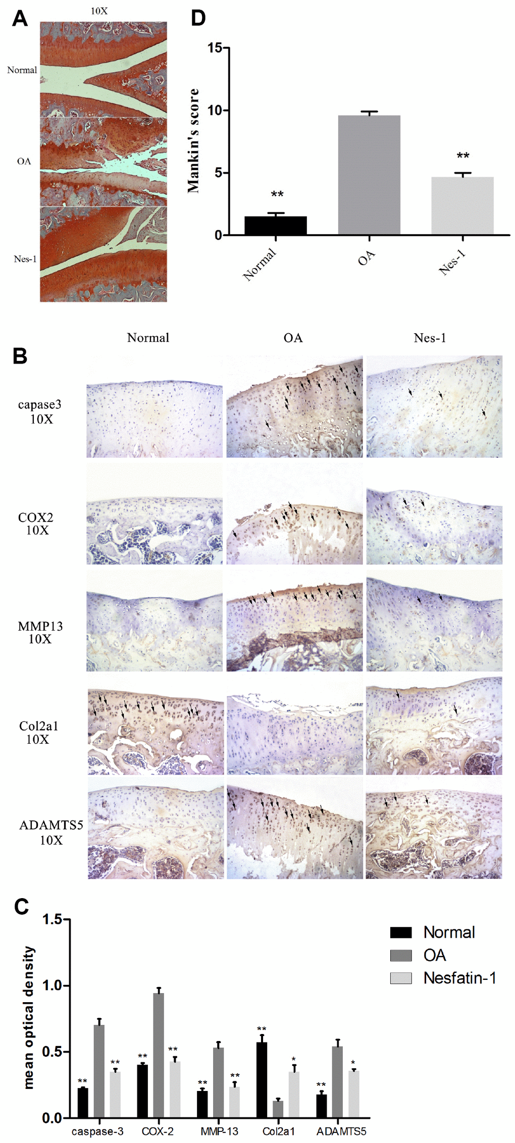 Moreover, in vivo immunohistochemistry indicated that, in the nesfatin-1-treated group, COX-2, MMP-13, Caspase 3, and ADAMTS5 were significantly decreased, while Col2al was increased compared to the OA group. Histological analysis indicated that nesfatin-1 could reverse the hypocellularity and structural damage observed in the OA model and ameliorate cartilage erosion. These results demonstrated that nesfatin-1 has anti-inflammatory and cartilage-protective effects in OA.