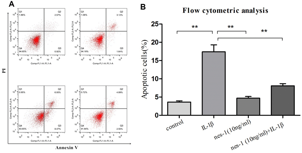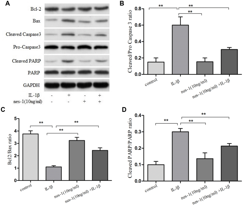 Western blot analysis revealed that the expression level of Bcl-2 declined, while that of Bax increased in the IL-1β-treated group, as compared to the nesfatin-1 pre-treated group (p < 0.01).