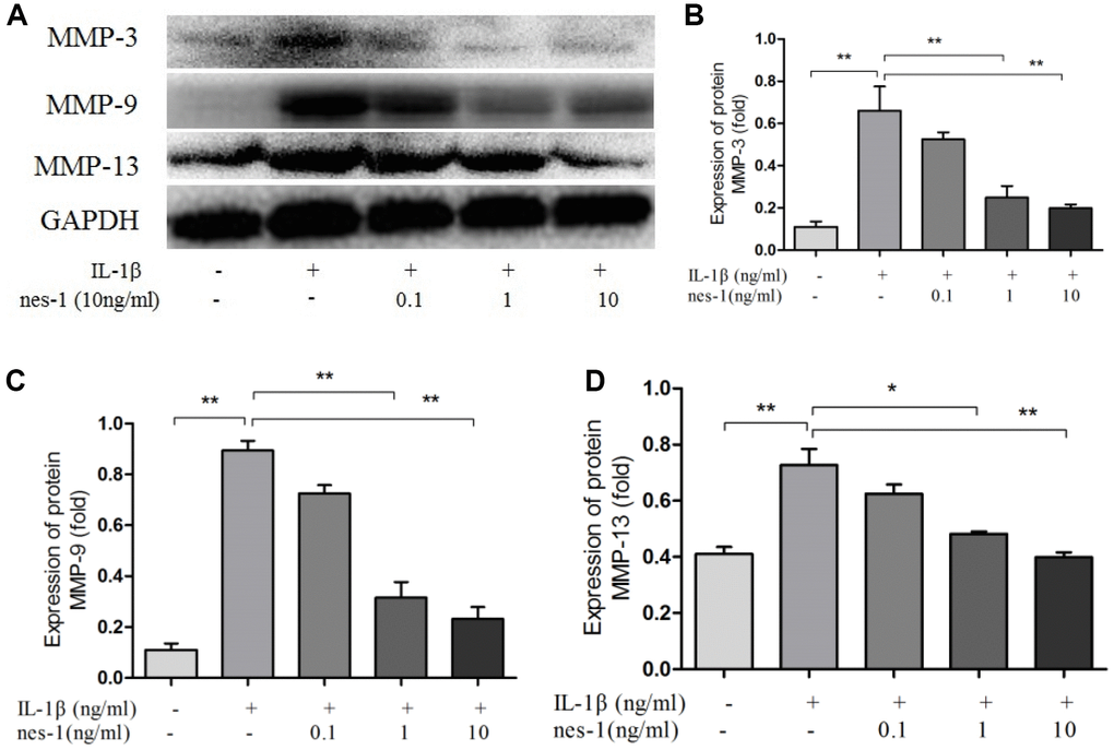 The cartilage matrix degradation induced by IL-1β is mediated by catabolic enzymes such as MMPs, including MMP-3, MMP-9, MMP-13, and ADAMTS5, which can cleave the main constituent of the extracellular matrix. Col2a1 is the major component of the cartilage matrix, the degradation and reduction of which are frequently observed in OA cartilage [29, 30]. Therefore, the effect of nesfatin-1 on the gene and protein expression of these enzymes was evaluated using real-time PCR and western blot analysis, and the secretion level in the supernatant was detected. Our results indicated that pre-treatment with nesfatin-1 can significantly inhibit secretion (Figure 5A–5C), mRNA level (Figure 5D–5F), and protein expression (Figure 6A–6D) of MMP-3, MMP-9, MMP-13, and ADAMTS5 (Figure 7A, 7B, 7E), and increase the mRNA level and protein expression of Col2a1 (Figure 7A, 7C, 7D), as compared to IL-1β treatment chondrocytes.