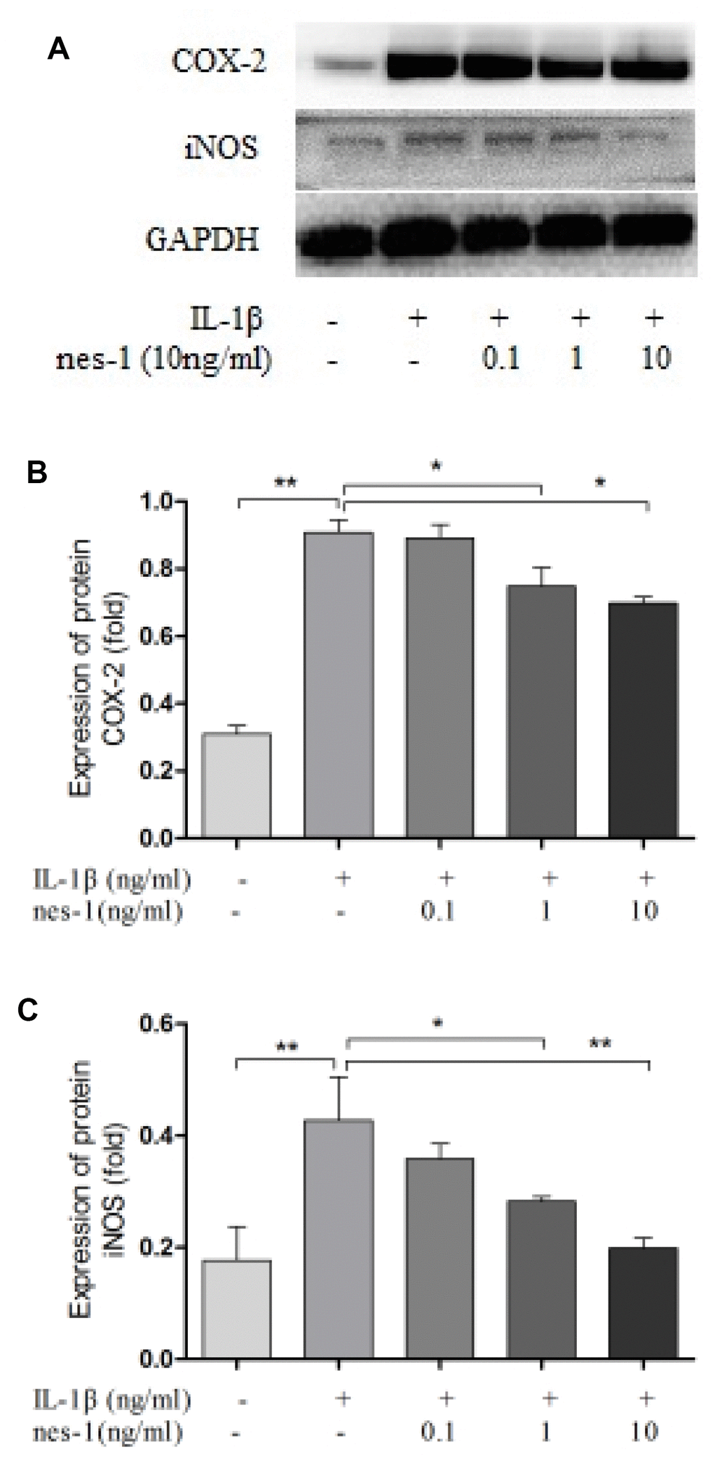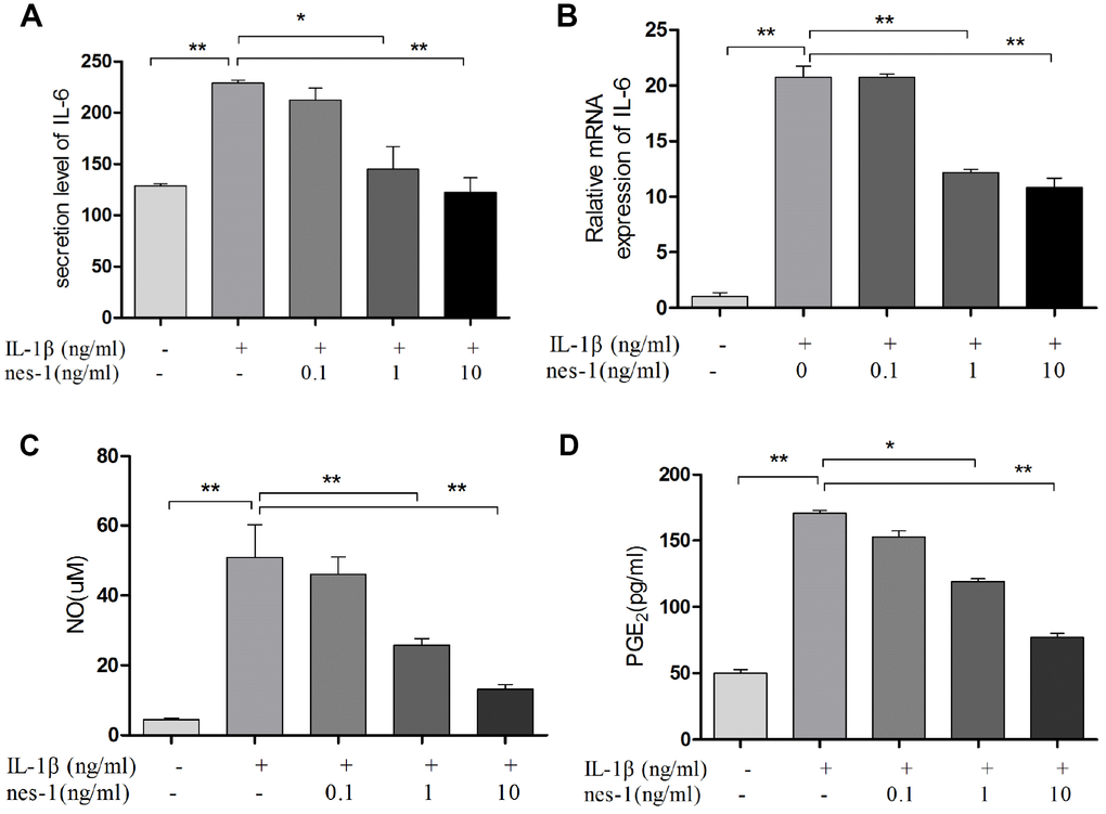 Nitric oxide, PGE2, and IL-6 are inflammatory mediators, which are involved in the degradation of articular cartilage. IL-1β can up-regulate the expression of iNOS and COX-2, as well as the production of NO and PGE2 in OA. The inhibition of NO or PGE2 can attenuate the progression of OA. Hence, the effect of nesfatin-1 on iNOS and COX-2 gene expression and the protein levels in IL-1β-induced chondrocytes were investigated, and the secretion level of IL-6 in the supernatant was detected. The results demonstrated that nesfatin-1 suppressed the protein levels of iNOS and COX-2 (Figure 8A–8C), as well as the inflammatory mediator IL-6 (Figure 9A, 9B). The production of PGE2 was determined by ELISA and the production of NO was assessed by Griess reaction. Nesfatin-1 treatment resulted in significant down- regulation of NO and PGE2 production induced by IL-1β in chondrocytes (Figure 9C, 9D).