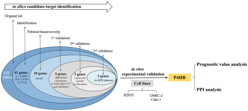 ARGs showing very high discriminating ability (AUC>0.90) in the TCGA dataset were searched in Pubmed to identify those never reported in KIRC, and then were validated in a first round validation in the two GEO dataset. Genes passing the first validation were then validated in the Beroukhim dataset. Genes passing the second validation were then validated in the HPA dataset. Genes passing screening phase and all four validations were regards as novel potential KIRC biomarkers. P4HB was selected according to this procedure. Empty cells indicate lack of validation. Genes showing 0 value in the “Novelty” column are genes without records for KIRC in Pubmed, whereas genes showing 1 value are genes with records.