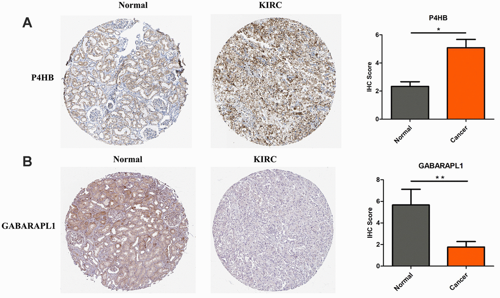 The protein expression levels of CASP4, P4HB and GABARAPL1 were then analyzed in HPA database. Fifty-nine histological section images for KIRC and normal kidney tissues were analyzed. The results showed that the protein expression levels of CASP4 have no significant difference between KIRCs and normal tissues (data not shown). Consistent to the above validation at mRNA level, the protein level of P4HB is significantly increased in KIRC tissues, and GABARAPL1 is decreased in KIRC tissues compared to that in normal tissues (Figure 2).