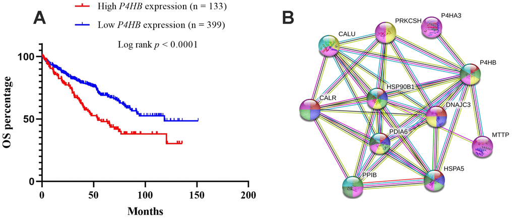 The STRING database was used to explore known and predicted protein–protein association with P4HB. As shown in Figure 4, the top 10 predicted functional partners were as follows: CALR (score = 0.999), HSP90B1 (score = 0.998), HSPA5 (score = 0.991), PPIB (score = 0.986), MTTP (score = 0.987), P4HA3 (score = 0.994), PDIA6 (score = 0.994), PRKCSH (score = 0.987), CALU (score = 0.991), and DNAJC3 (score = 0.986) (Figure 4B). Function enrichment analysis against gene ontology in this network indicated that for biological processes, this network is most enriched in response to endoplasmic reticulum (ER) stress, endoplasmic reticulum unfolded protein response, protein folding and post-translational protein modification, while for cellular components, it is significantly enriched in endoplasmic reticulum lumen, endoplasmic reticulum chaperone complex, and melanosome.