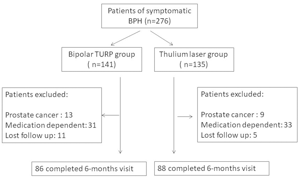 Benign prostatic hyperplasia (BPH) is a major cause of lower urinary tract symptoms (LUTSs) in the aging male population, and it affects approximately 210 million men globally [1]. In addition, the prevalence of BPH/LUTS is expected to increase sharply in the coming decades [2]. The symptoms of BPH include decreased urinary flow and advancing voiding and storage symptoms that result in acute or chronic urinary retention (UR) [3]. Moderate to severe LUTS also significantly affects all quality of life (QoL) parameters for aging men [4]. Both α1-blockers and transurethral resection of the prostate (TURP) achieve favorable outcomes in most patients with benign prostate obstruction (BPO) [5]. Although medical treatment is available for BPO, surgical intervention is an appropriate option for patients with moderate to severe LUTS and for patients who have developed acute UR or other BPH-related complications [6]. Although TURP remains the dominant and definitive treatment option for BPH/BPO [7], it involves potential morbidities, including urinary tract infection(UTI) (1.7%–8.2%), UR (3%–9%), hematuria with clot retention (2%–5%), urethral strictures (2.2%–9.8%), and bladder neck contractures (0.3%–9.2%) [8]. As a result, a variety of laser systems and techniques for treating BPH/BPO have been introduced to overcome the aforementioned problems, with the aims of lower blood loss, clearer vision of the surgical field, shorter catheterization time, and lower morbidity [9]. The high-power continuous-wave Thulium laser was first introduced in 2005 for treating BPH/BPO [10]. According to the latest guidelines, Thulium laser enucleation of the prostate (ThuLEP) is recommended as an appropriate and prostate size–independent alternative to resolve BPH/BPO [11]. In this study, we conducted a head-to-head comparison of the surgical outcomes of the 120-W Thulium laser (Vela™ XL) enucleation of the prostate with those of the bipolar resection of the prostate in terms of efficacy, safety, and improvement of life quality in patients with symptomatic BPH/BPO.