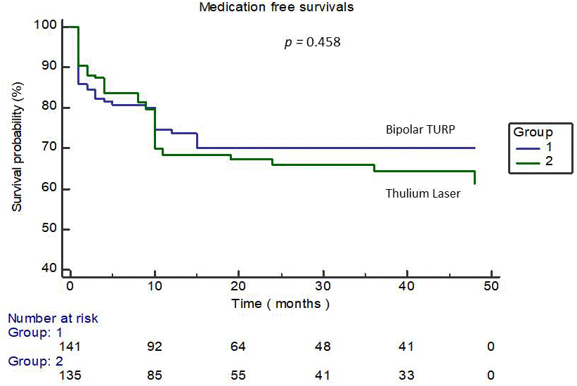 Eighty-six patients of the TURP group and 88 of the ThuLEP group completed this tracking program for at least 6 months, as shown in figure 1. Both groups achieved favorable surgical outcomes in terms of Qmax, IPSS score, and QoL score at post-op 2 weeks, 3 months, and 6 months, as presented in Table 4. However, the ThuLEP group showed superior outcomes to the TURP group at post-op 2 weeks regarding the changes in the IPSS voiding score (−12.4 ± 3.7vs.−10.8 ± 4.4, p=0.003) as well as changes in the QoL score (−3.1 ± 0.8vs.−2.8 ± 0.9, p=0.006). The outcomes in the ThuLEP group remained superior to those of the TURP group regarding changes in the QoL score (−3.4 ± 0.9vs.−3.1 ± 0.9, p=0.045) at 3 months post-op. Nevertheless, during follow-up at 6 months after surgery, all the indicators of the two groups were statistically identical, suggesting that the efficacy of the two techniques was identical at 6 months post-op. Given that the optimal results of surgical treatment for BPH/BPO are completely independent from urological medication, the medication-free survival rates were evaluated between the two groups, as illustrated in Figure 3. Kaplan–Meier curves revealed that approximately70% of patients in our study did not need any urological medication (including α-blockers, antimuscarinics, β3 agonists, bethanechol, and DDAVP) within 2 years post-op. The medication-free survival rates of both groups were also statistically identical (p=0.458).A total of eight patients (6 in the TURP groups and 2 in the ThuLEP group) in our study developed bladder neck contracture before the end of follow-up, with a mean time-to-contracture of 6.7 months.