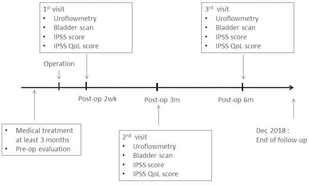 Perioperative outcomes were recorded, including the operating time, surgical complications, analgesic consumption, NRS score of pain [29], post-operative re-catheterization, and hospital stay length. At 2 weeks and 3 and 6 months after surgery, patients returned for a follow-up visit. During the visits, the IPSS score, QoL, Qmax, PVR, and rate of urological medication continuity were evaluated, and the incidence of complications was recorded. If patients had any problems after 6 months of follow-up, they were asked to return to the clinic for evaluation and treatment. The study flow diagram is illustrated in Figure 4.