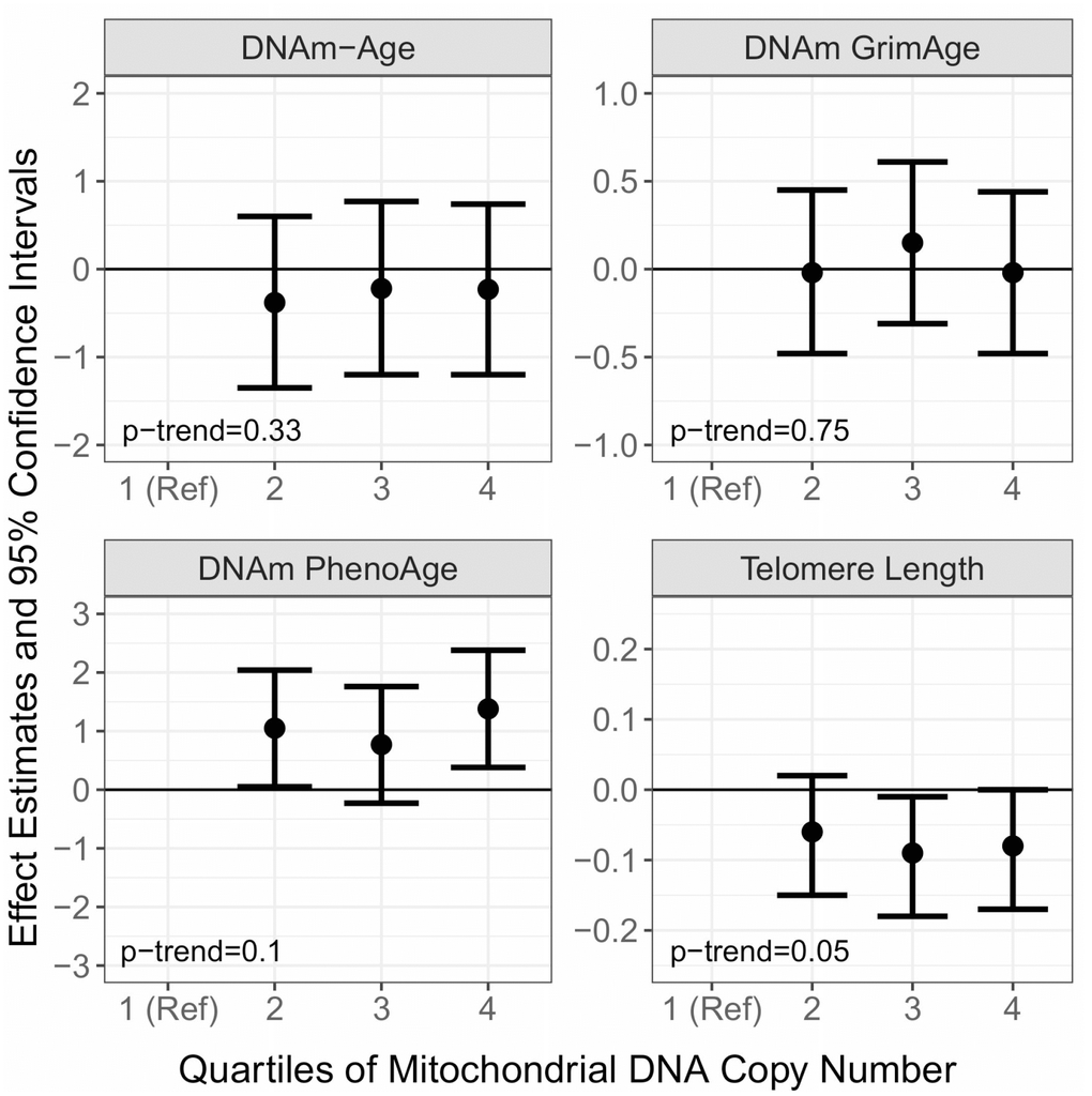 First, we sought to extend our previous analyses [31] using additional samples from 2011-2013 and to other aging biomarkers by examining the cross-sectional associations of mtDNAcn with DNAm-Age, DNAm-PhenoAge, DNAm-GrimAge, and leukocyte telomere length (Figure 1 and Supplementary Table 2). In multivariable models adjusting for chronological age, smoking, alcohol use, BMI, hypertension status, CHD status, diabetes status, blood cell type composition, and time since first visit, we observed a monotonic negative association between mtDNAcn and cross-sectional measures of DNAm-Age (p-trend=0.03). We also observed that compared to the lowest quartile of mtDNAcn, Q2 (β=-0.80; 95% CI=-1.49, -0.12; p=0.02), Q3 (β=-1.01; 95% CI=-1.75, -0.26; p=0.01), and Q4 (β=-0.83; 95% CI=-1.65, -0.02; p=0.04) of mtDNAcn were all negatively associated with DNAm-PhenoAge. However, there were no monotonic trends across these quartiles (p-trend=0.82). We did not observe associations of mtDNAcn with DNAm-GrimAge or leukocyte telomere length.