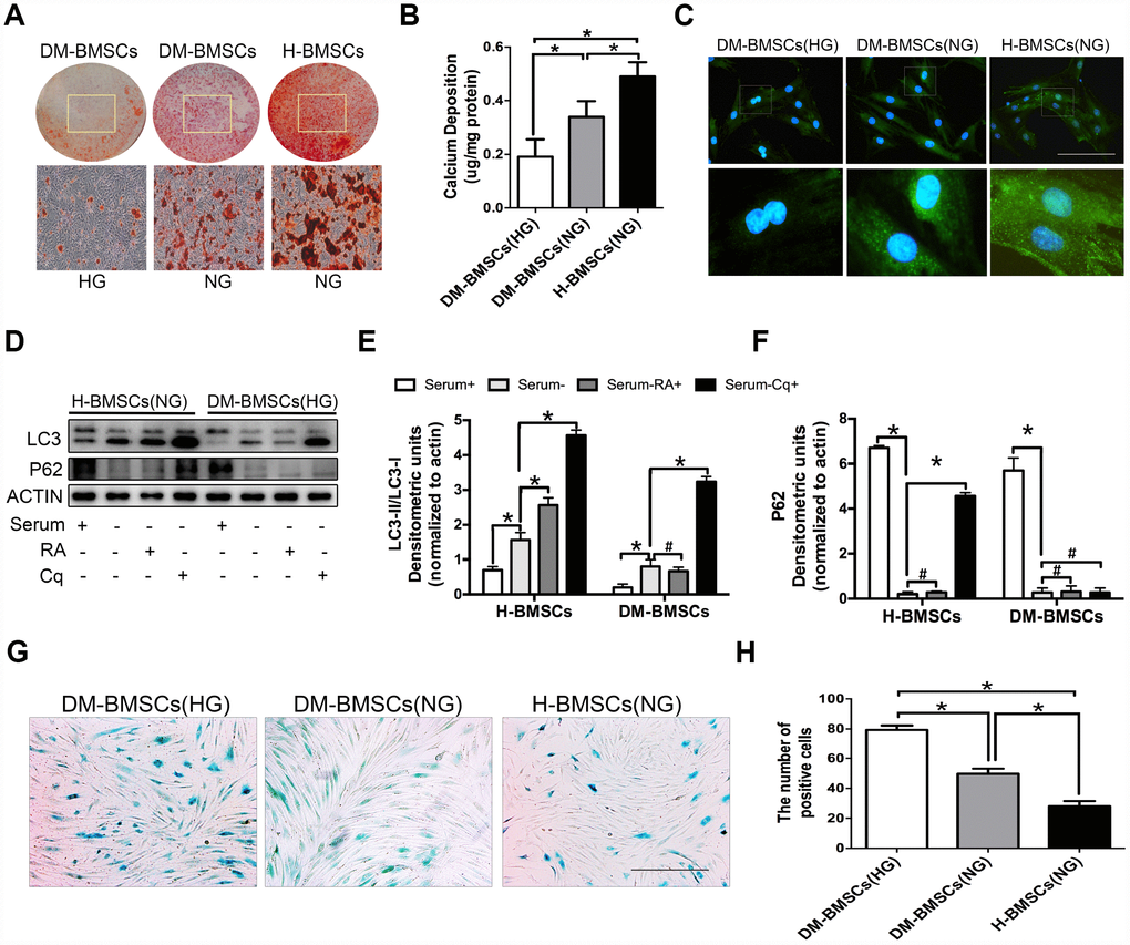 We compared autophagy levels between DM-BMSCs and H-BMSCs by imaging GFP-LC3b-labeled BMSCs. The results revealed that DM-BMSCs weakly expressed LC3 after 6 hours of serum deprivation compared with H-BMSCs (Figure 1C). To explore which stage of autophagy was suppressed, we detected the expression of LC3 and P62 in DM-BMSCs and H-BMSCs after using rapamycin (RA, autophagy activator at the early stagy) or chloroquine (Cq, autophagy inhibitor at the late stagy). The results indicated the LC3-II/LC3-I ratio increased, and the expression of P62 decreased in both DM-BMSCs and H-BMSCs after serum deprivation, but the expression of LC3-II in DM-BMSCs was less than that in H-BMSCs. After addition of RA, H-BMSCs showed an increased LC3-II/LC3-I ratio, but DM-BMSCs did not show a similar change. Moreover, after addition of Cq, P62 expression in H-BMSCs increased significantly, but it did not in DM-BMSCs (Figure 1D–1F). These results suggested that the autophagy process of DM-BMSCs was suppressed at the early stage, which then led to a decreased autophagy levels. We also compared the senescence phenotype between DM-BMSCs and H-BMSCs by senescence-associated β-galactosidase (SA-β-Gal) staining and found more SA-β-Gal-positive cells in DM-BMSCs than in H-BMSCs (Figure 1G, 1H). Together, these data indicated that DM-BMSCs showed a decreased osteogenic differentiation and autophagy levels, and an increased senescent phenotype.