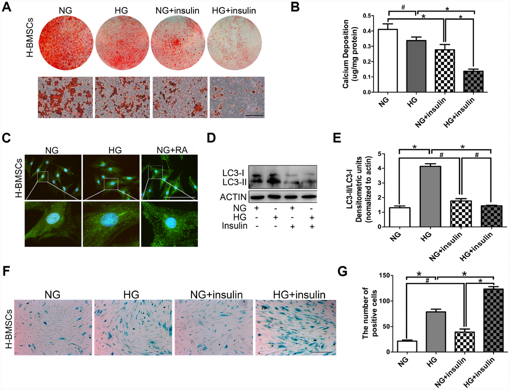 To detect the potential role of autophagy in insulin impeding osteogenic differentiation of BMSCs, GFP-LC3b-labeled H-BMSCs were cultured in normal or high-glucose medium. After 6 hours of serum deprivation, H-BMSCs in hyperglycemic conditions expressed more LC3 than that in normoglycemic conditions (Figure 2C). The expression of LC3-II and LC3-II/LC3-I ratio was higher in hyperglycemic conditions but significantly decreased in the group of insulin addition (Figure 2D, 2E). In addition, SA-β-Gal staining showed that more senescent cells were observed in hyperglycemic conditions than in normoglycemic conditions, and the most obvious senescent phenotype was found in high-glucose and insulin conditions (Figure 2F, 2G). These data indicated that insulin impeded osteogenic differentiation of H-BMSCs by inhibiting autophagy and promoting senescence.